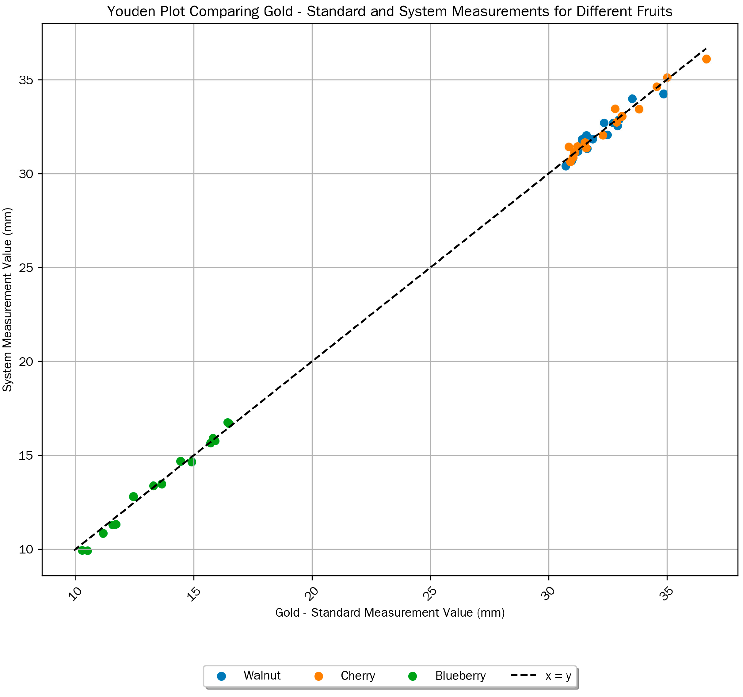 2 (>0.98), and no significant statistical bias across all fruit types, confirming strong accuracy and robustness. These results fully validate the system’s multi-fruit compatibility and suitability for practical breeding applications. The agreement between gold-standard and system measurements is visually illustrated in the Youden plot (