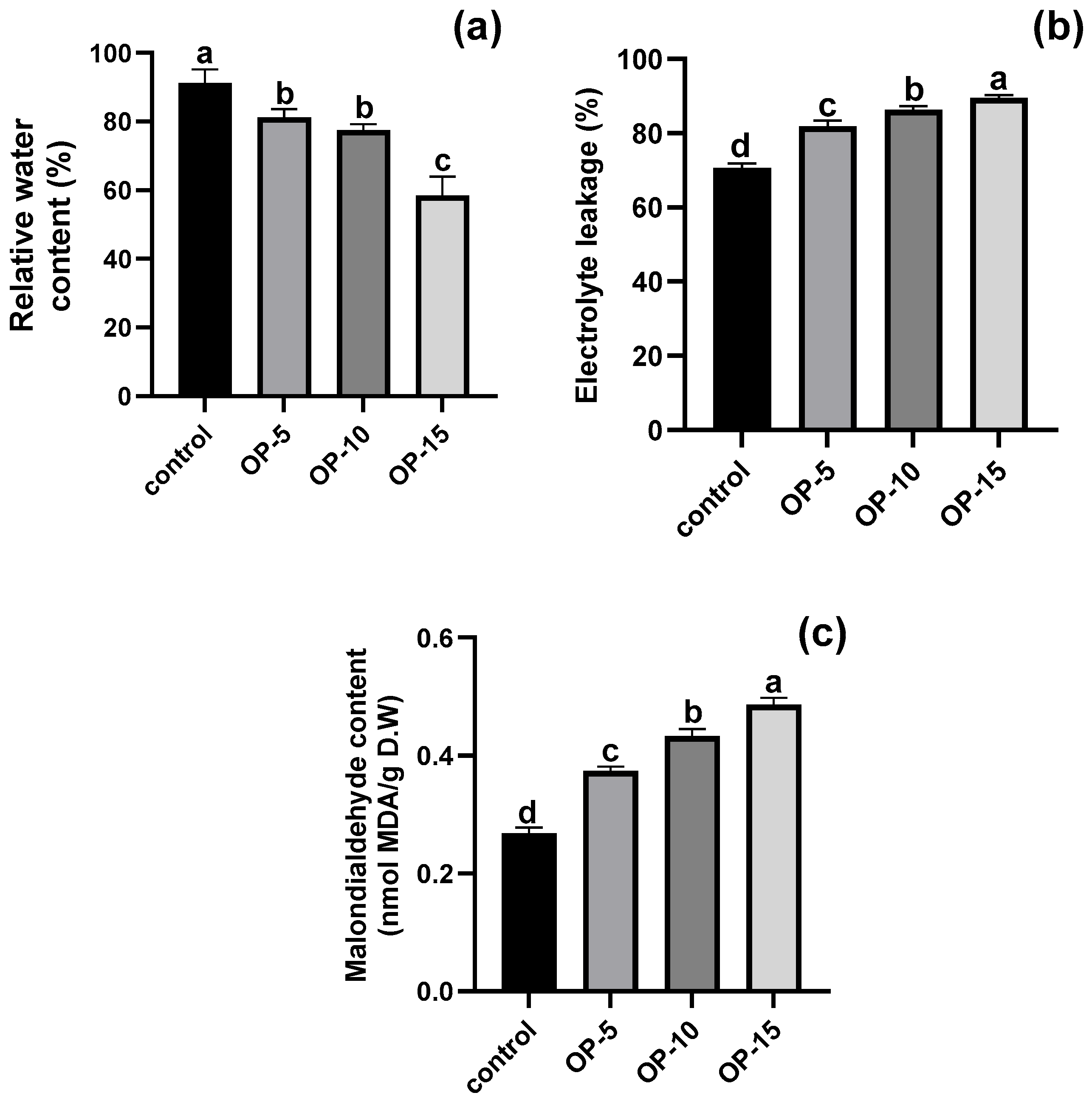 3.2. Effect of OPF on Relative Water Content, Electrolyte Leakage and Malondialdehyde Content