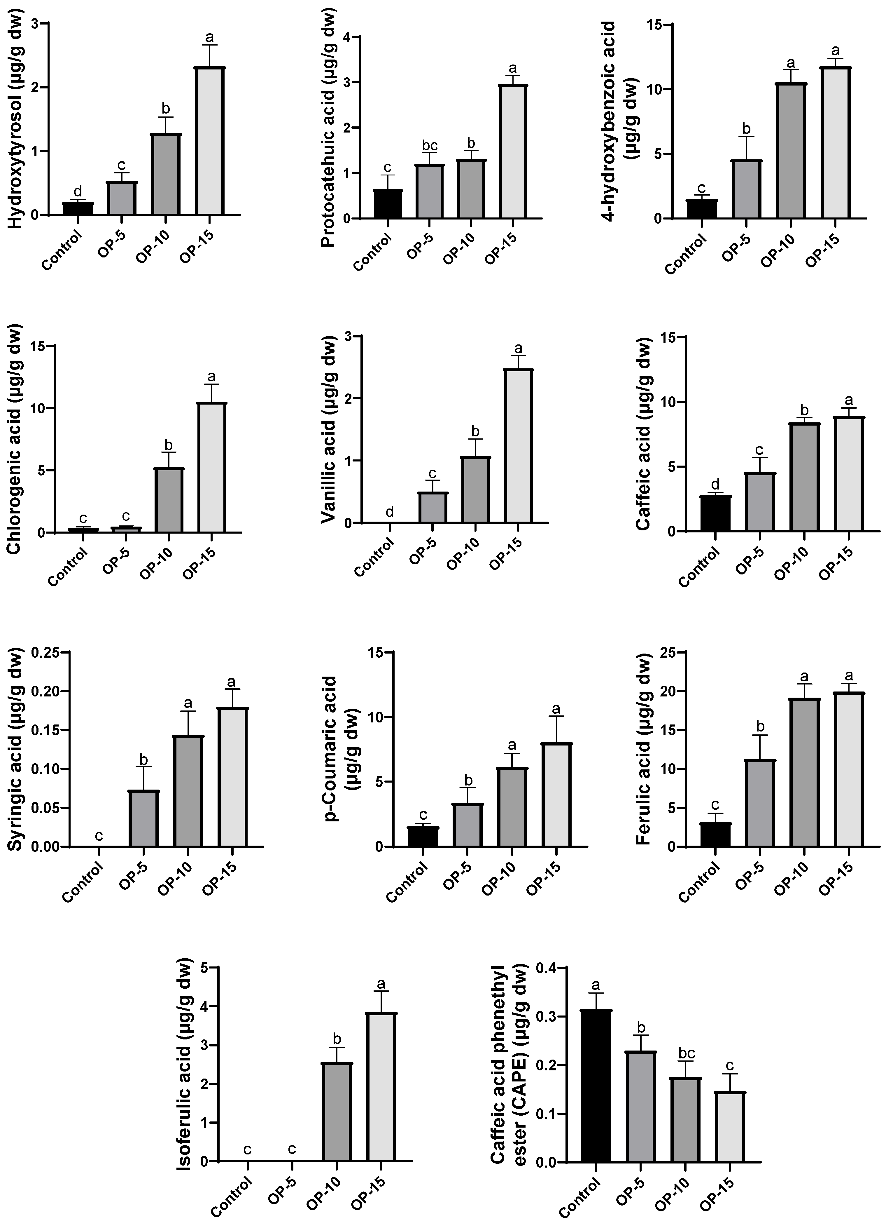 3.3. Effect of OPF on the Phenolic Content of V. faba L.
