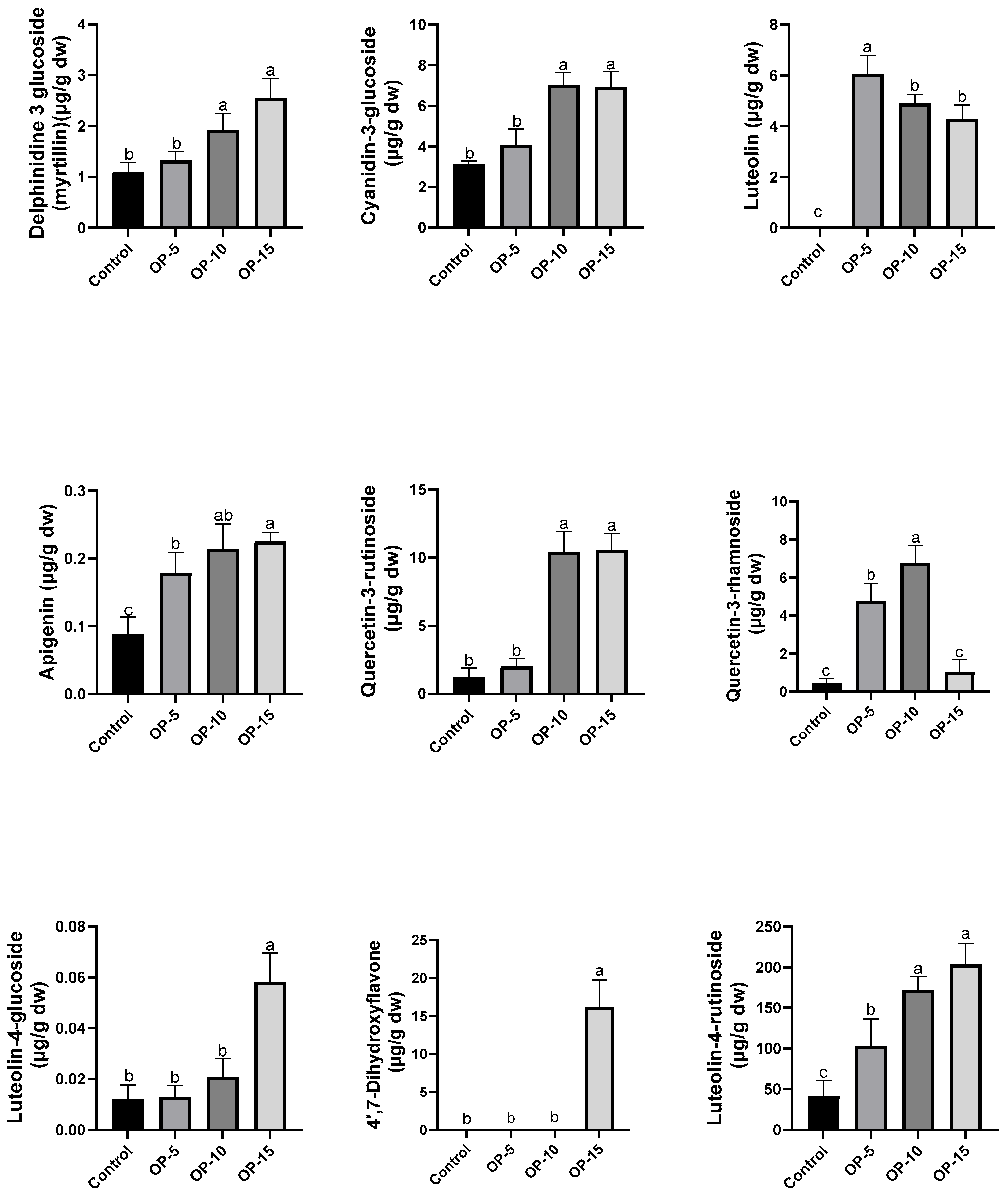 3.4. Effect of OPF on the Flavonoid Content of V. faba L.