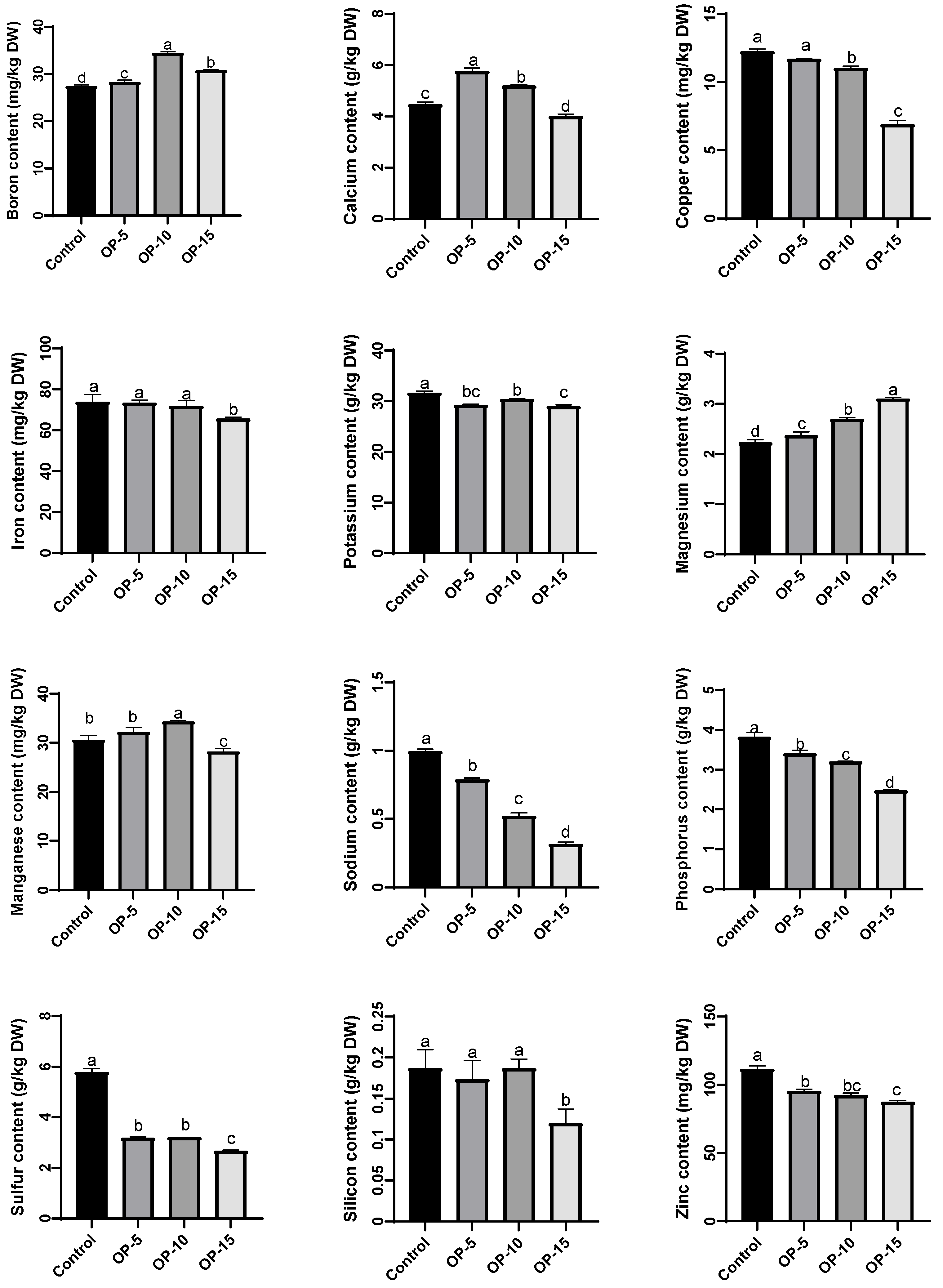 3.5. Effect of OPF on Tissue Nutrient Concentration in V. faba L.