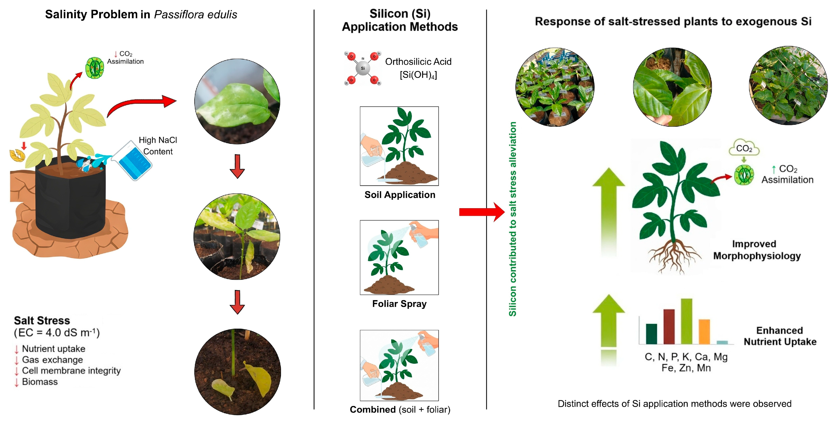 Ferreira RdS, Pereira RF, Silva ACZd, Brito Neto JFd, Lins LKS, Sousa CdS, Diniz JPC, Fernandes FS, Maia OS, Gomes EA, et al. Silicon Application Methods Differentially Modulate Nutrient Uptake and Morphophysiology in Passiflora edulis Seedlings Under Salt Stress. Horticulturae. 2025; 11(11):1396. https://doi.org/10.3390/horticulturae11111396
