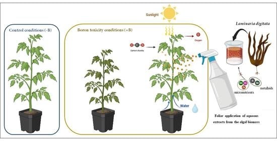 −1) on tomato plants; (ii) to determine whether the application of algal extracts, alone or in combination with metalloids and micronutrients, can mitigate the adverse effects of excess B in the nutrient solution; and (iii) to identify the treatment that provides the most effective response. To this end, physiological, biochemical, and metabolic parameters were assessed.
