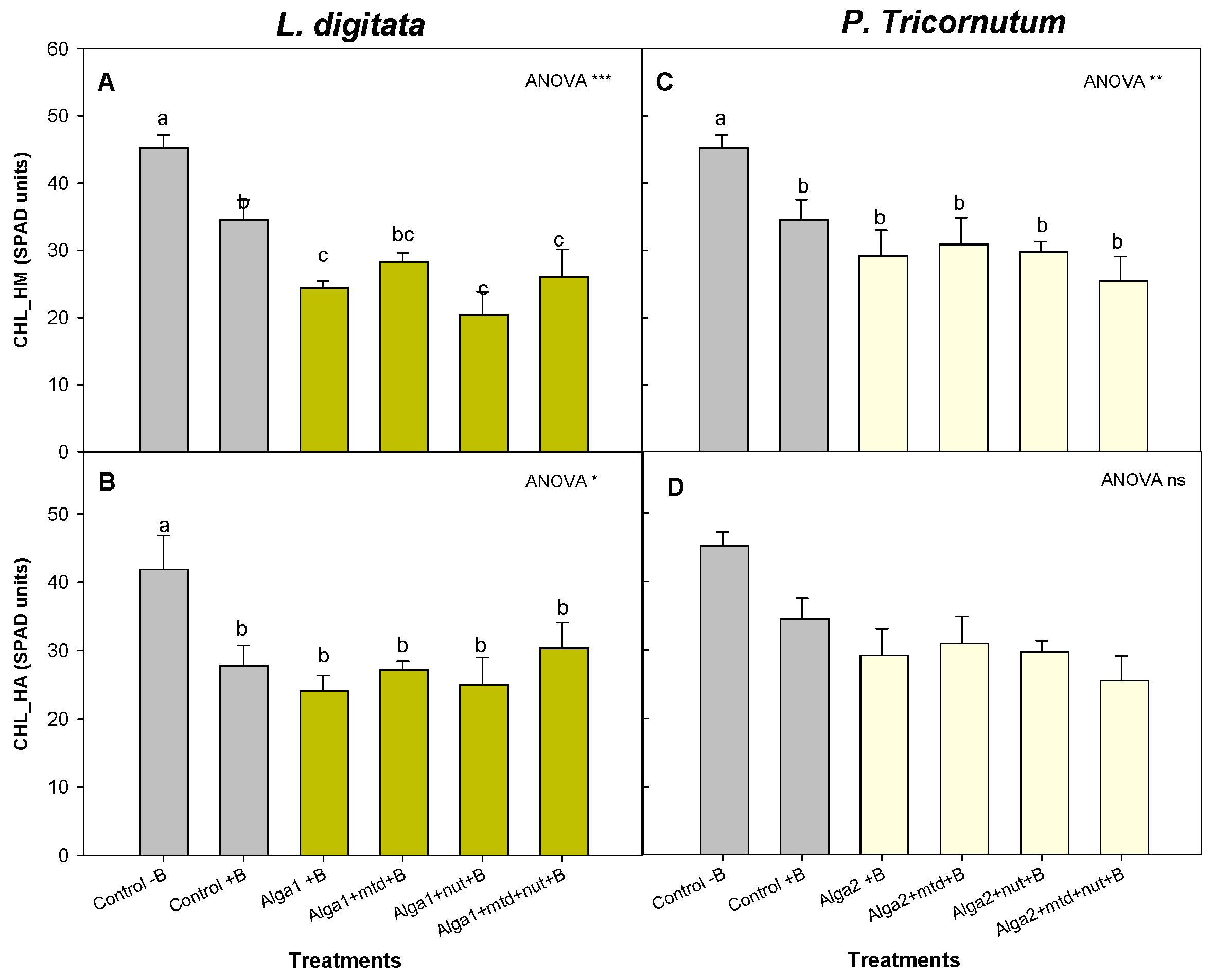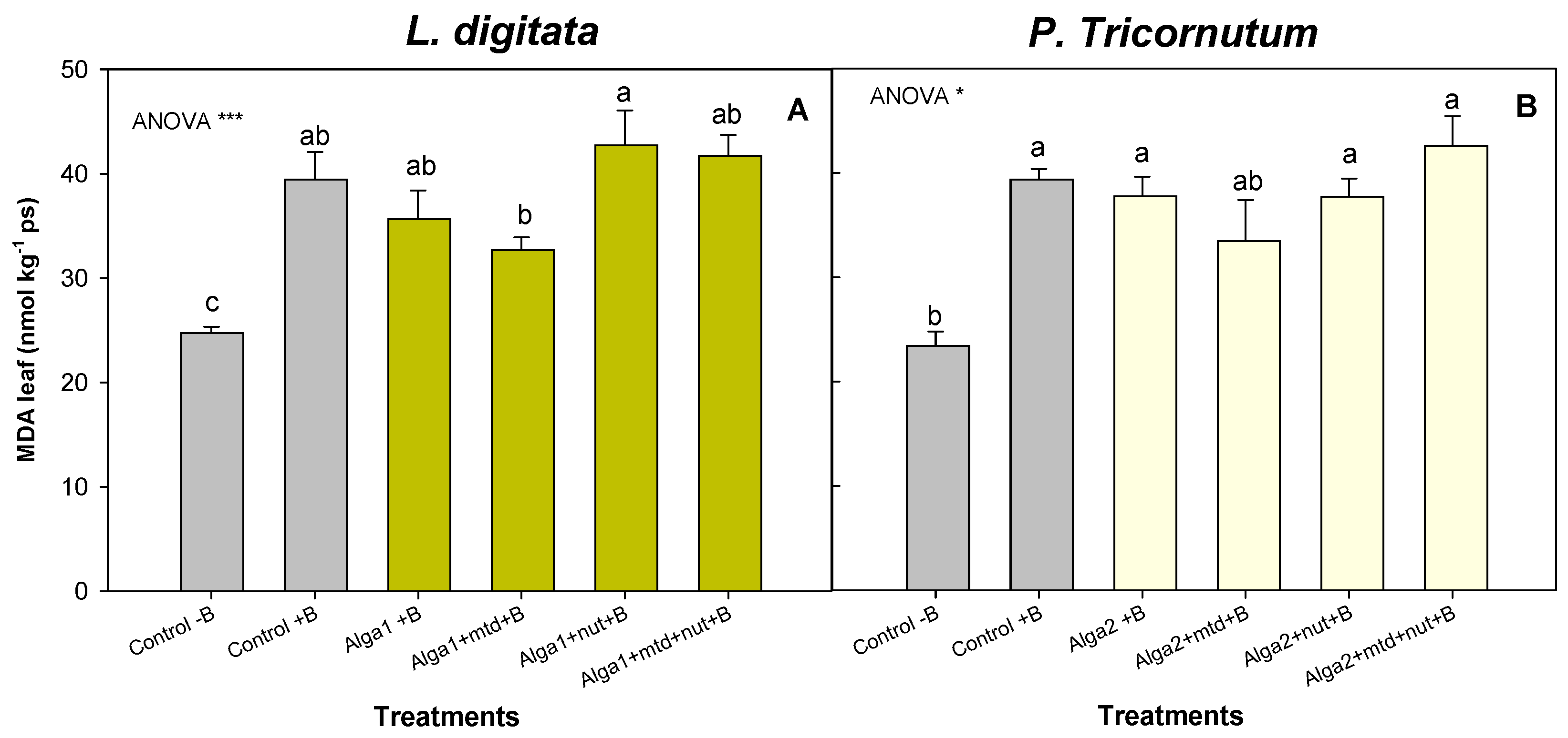 Application of products enriched with micronutrients (+nut) or with both metalloids and micronutrients (+mtd + nut) increased foliar B concentration for both algal species. However, in