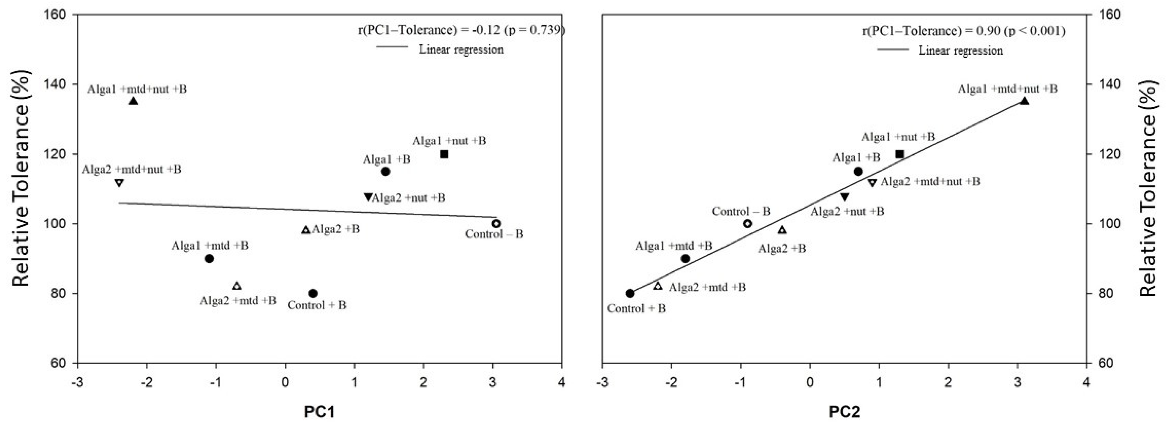 Correlation analysis between relative tolerance and PC1/PC2 scores revealed that PC1 was not significantly associated with relative tolerance (r = −0.12; p > 0.05), indicating that nutritional changes represented by this axis did not translate into biomass improvement. In contrast, PC2 showed a strong positive correlation with relative tolerance (r = 0.90; p < 0.05), demonstrating that treatments with higher photosynthesis, stomatal conductance, water-use efficiency, and accumulation of osmoprotective metabolites scored high on PC2 and were also those that best maintained growth under boron excess. These findings confirm that boron tolerance in tomato plants is primarily associated with primary metabolism and gas-exchange parameters.