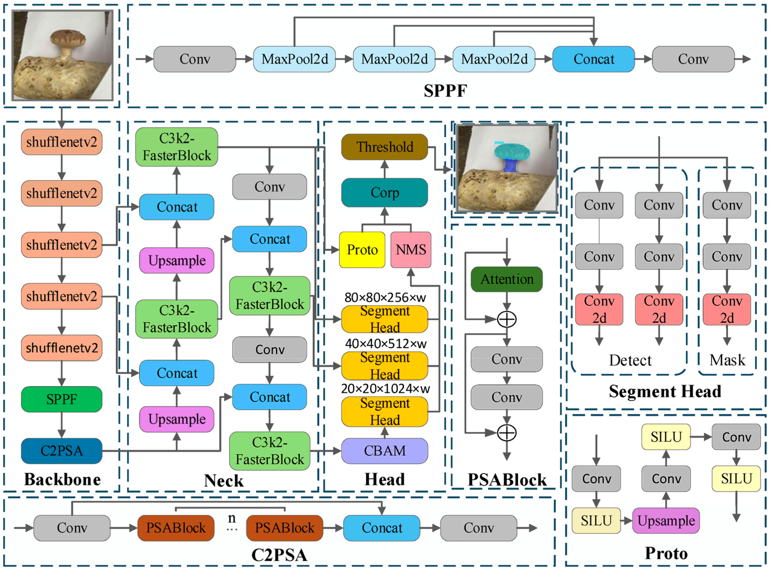 25]. This study is based on the YOLOv11n-Seg model; a lightweight YOLO-SFCB model was constructed to accurately identify and segment the stipe and pileus of