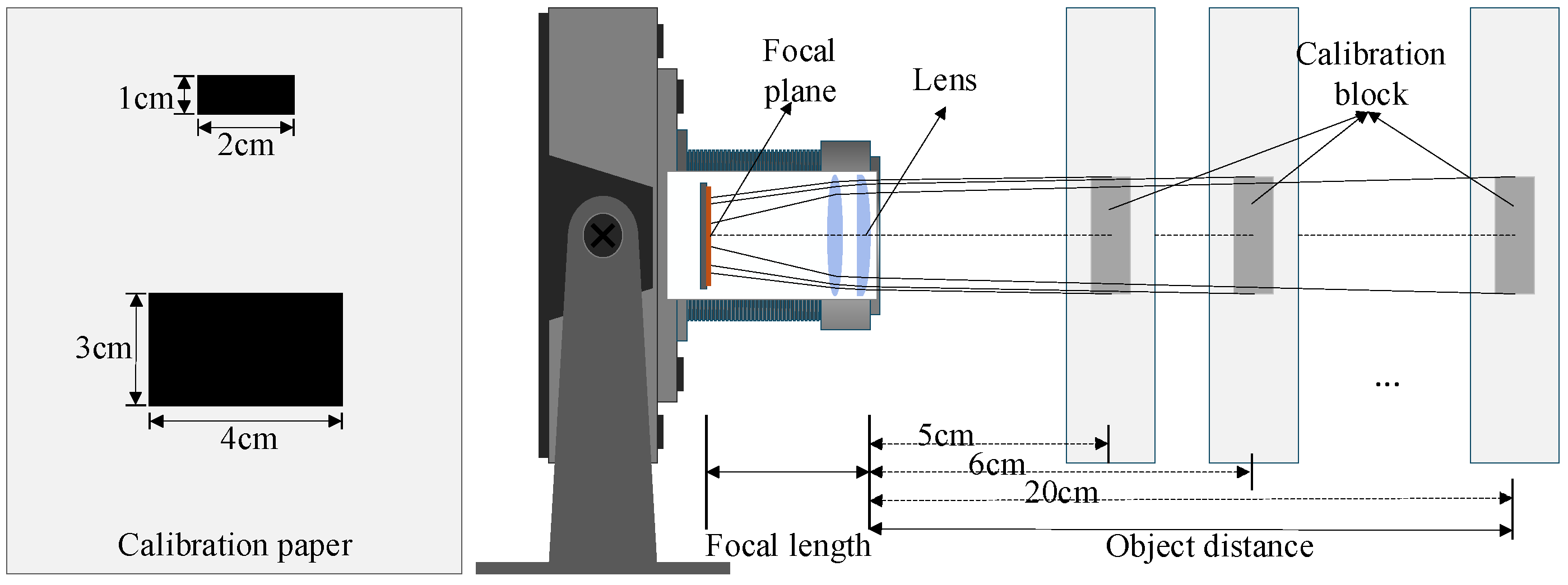 Using industrial cameras to capture images of standard blocks and calculating the pixel-physical length ratio at distances of 5–20 cm, it has been found through multiple experiments that the actual length represented by the pixel points increases with the increase in object distance, and exhibits a linear relationship. The fitted mathematical relationship is shown in Equation (6).