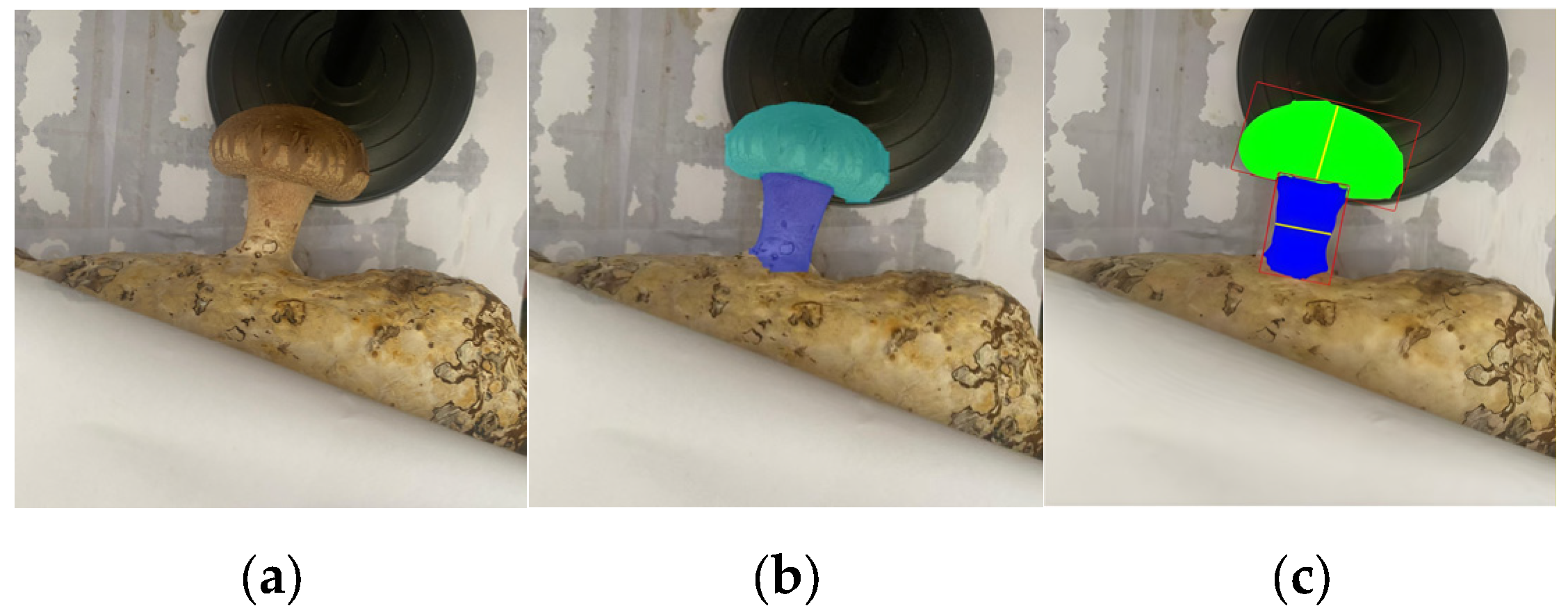 Lentinula edodes based on the YOLOv8x model and measured parameters such as stipe width and pileus thickness using 3D reconstruction technology, controlling the average error to around 10%. Although this method has high accuracy, its process is complex and its efficiency is low, making it difficult to meet the requirements of high-throughput phenotype detection. In contrast, measurement methods based on two-dimensional images are more convenient, such as Lu et al. [
