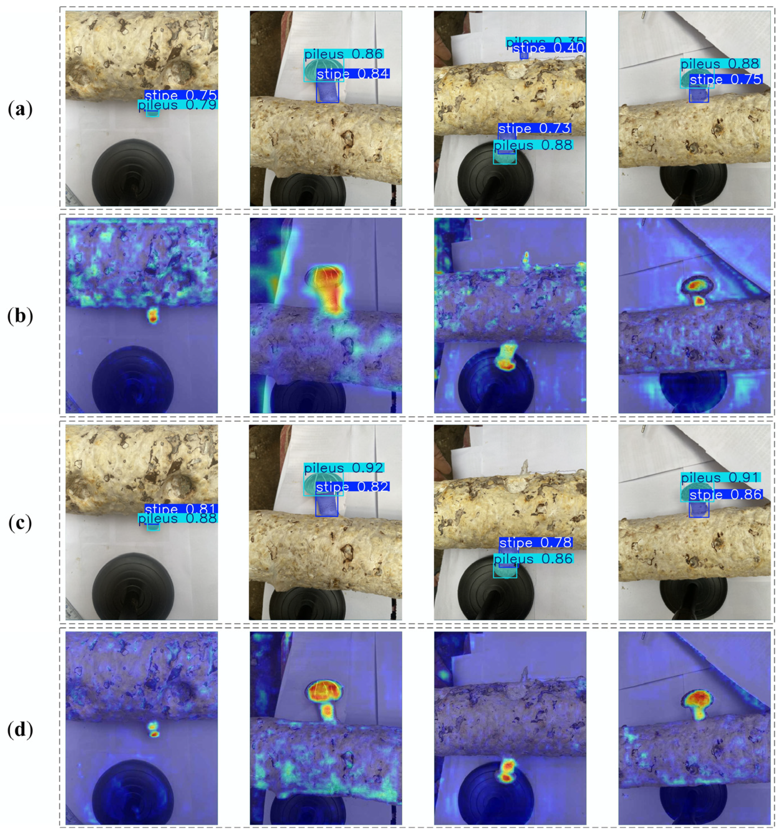 Lentinula edodes in early growth stages, with higher confidence levels. This indicates that incorporating the CBAM attention mechanism before the small object detection head effectively enhances the model’s ability to recognize small