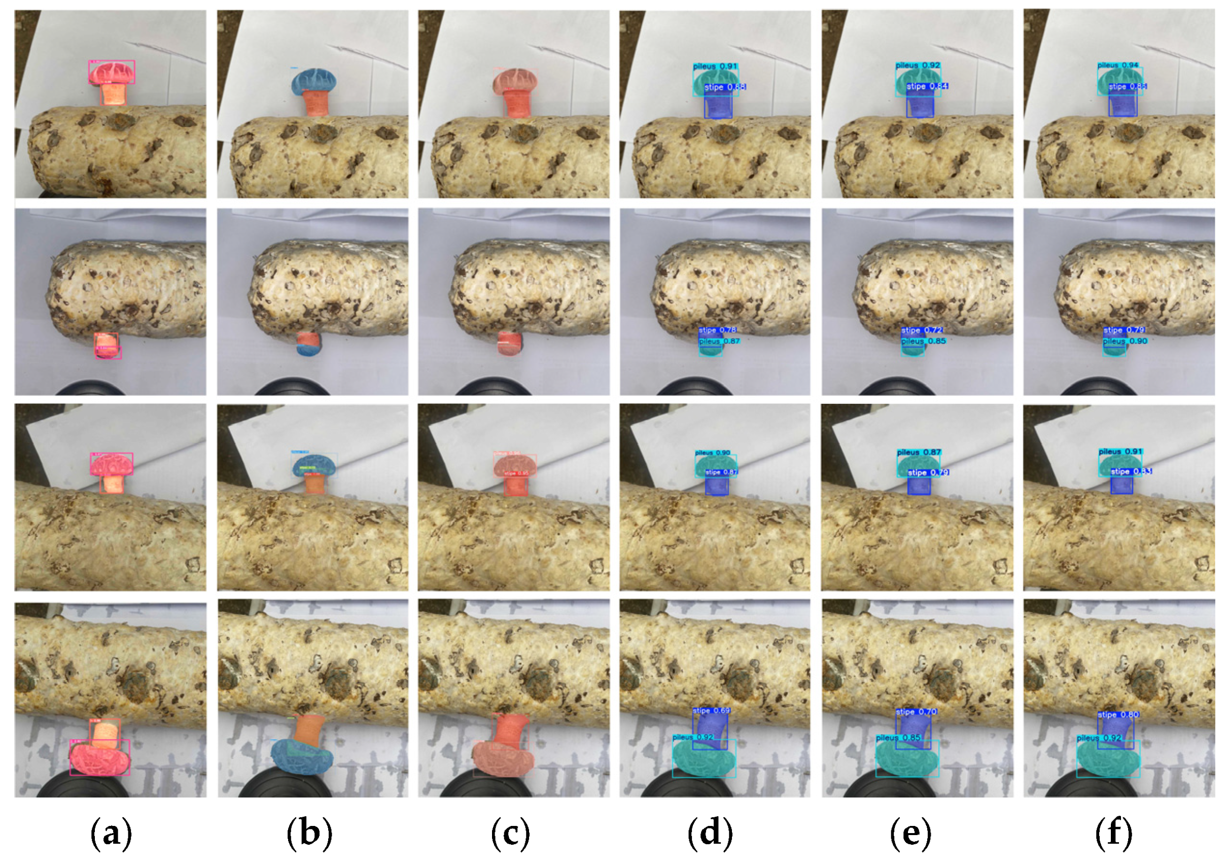 The combined results from ablation experiments and heatmap analysis indicate that eliminating irrelevant feature channels while strengthening the model’s spatial attention capability contributes to improved segmentation performance in Lentinula edodes recognition. Coupled with the lightweight efficiency of the ShuffleNetV2 architecture, these improvements make YOLO-SFCB particularly suitable for Lentinula edodes recognition and segmentation tasks under low-computation conditions.