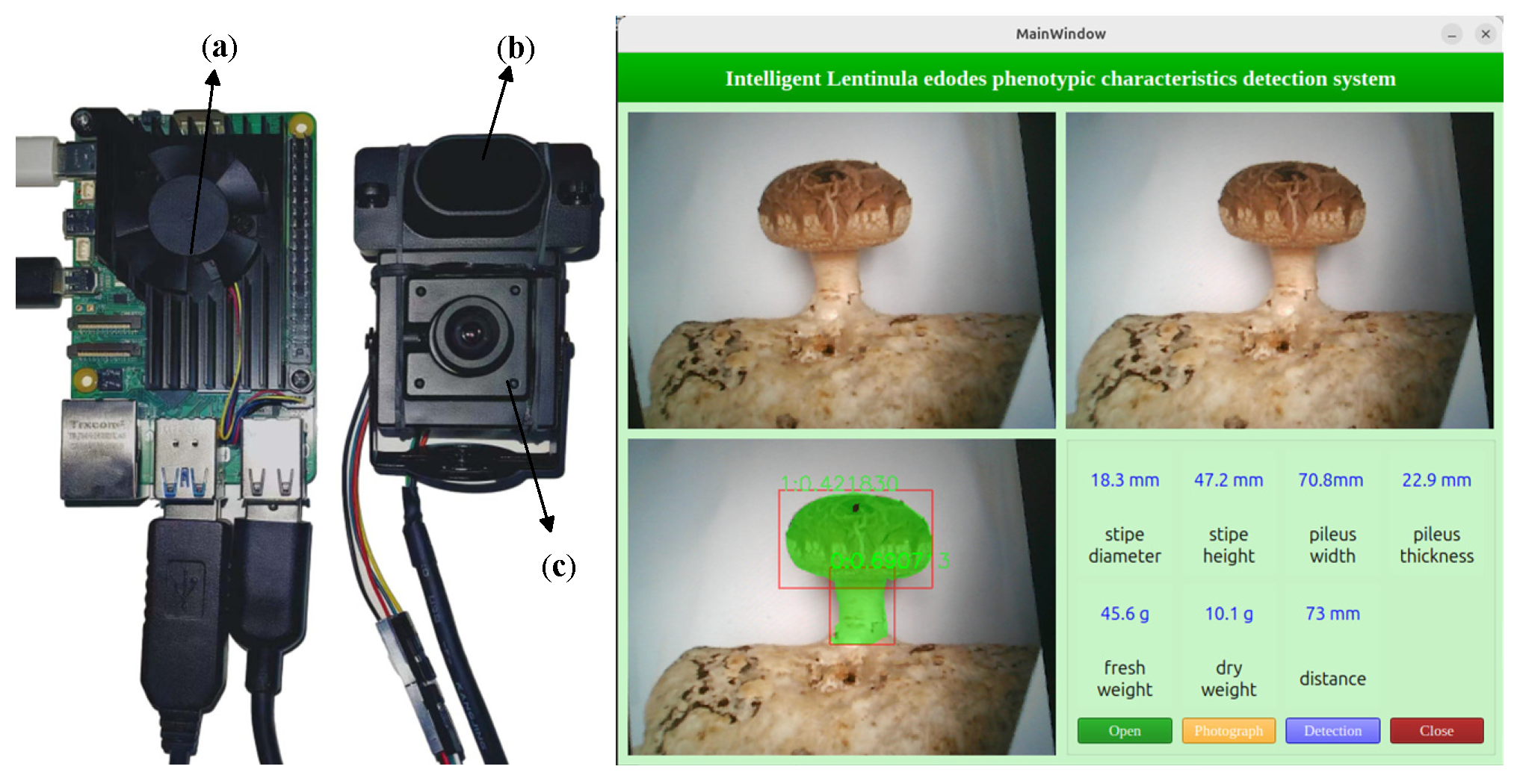 Lentinula edodes fruiting bodies on low-computing-power platforms. To evaluate the detection model’s operational performance, it was deployed on a Raspberry Pi 5. The Raspberry Pi 5 is compact and cost-effective, equipped with a 64-bit quad-core ARM Cortex-A76 processor running at 2.4 GHz and a VideoCore VII GPU operating at 800 MHz, delivering a 2 to 3 times performance improvement over the previous generation. Testing was conducted using the 8 GB memory version of the device, with a rated power of 25 W, as shown in