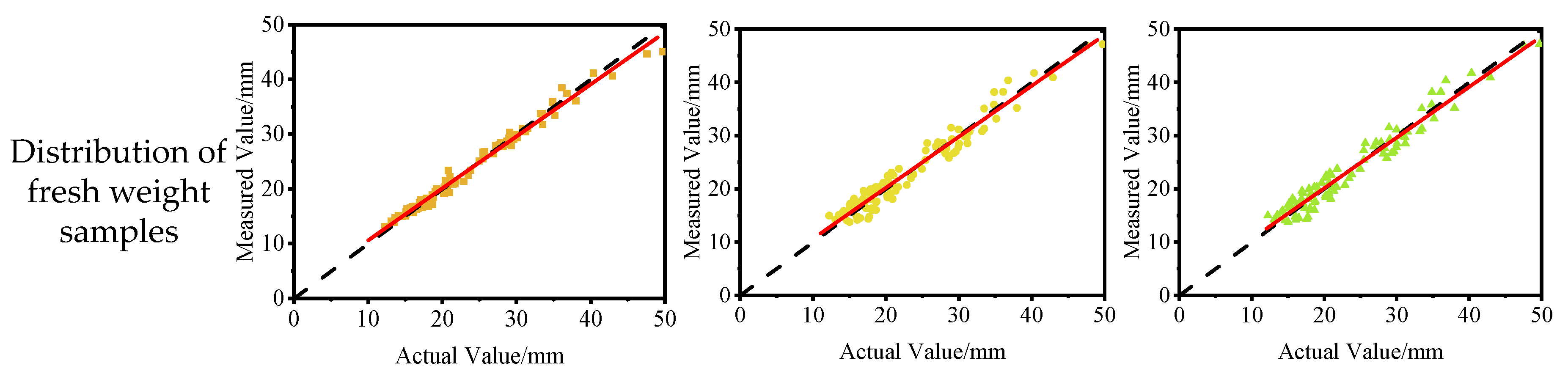 Figure 13, it can be seen that the four phenotype parameters have a high overall correlation with the actual values measured by the vernier caliper. The