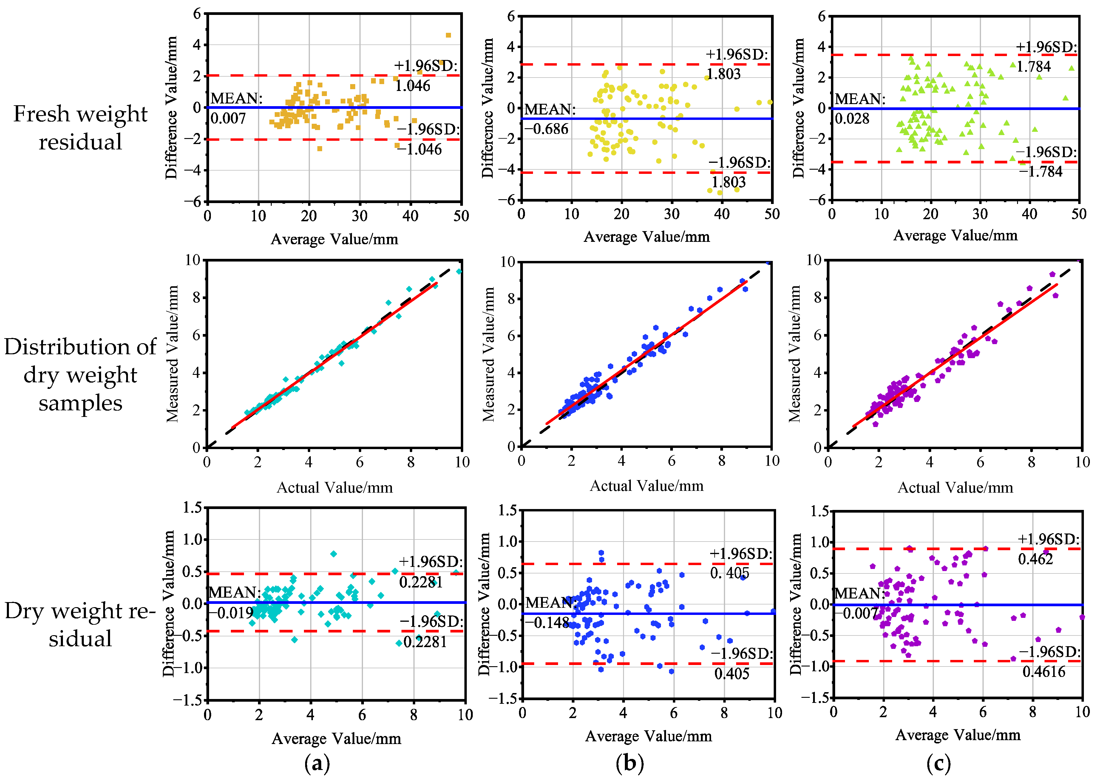 Figure 14 and Bland–Altman indicates that the least squares method predicts fresh and dry weight values closer to the true values, with smaller residuals, indicating the lowest overall error and best performance. In contrast, the results of random forest are relatively poor, with average