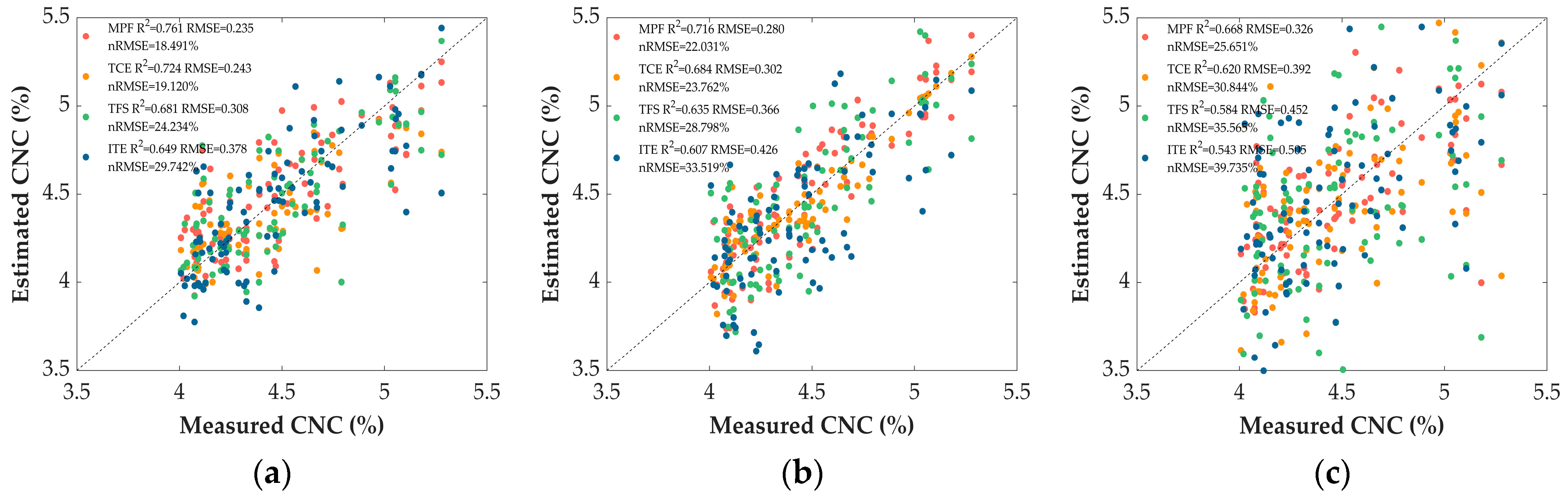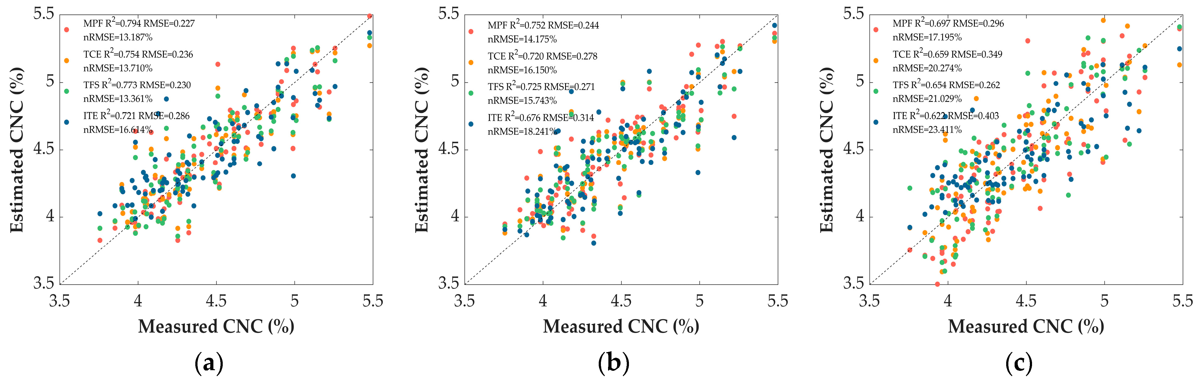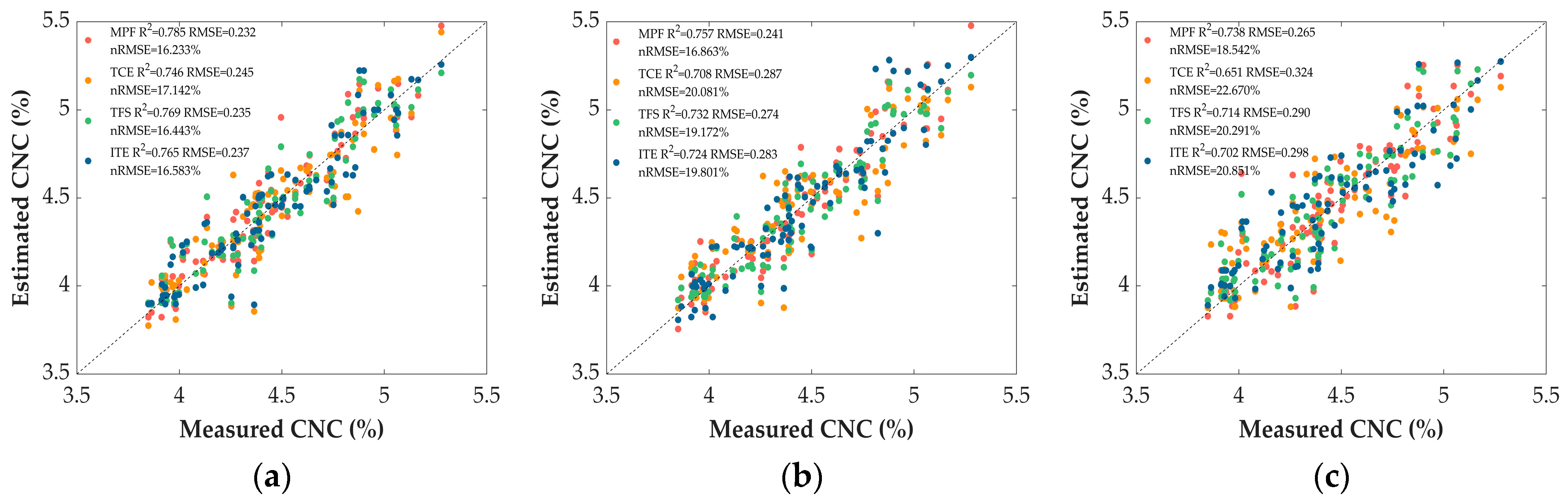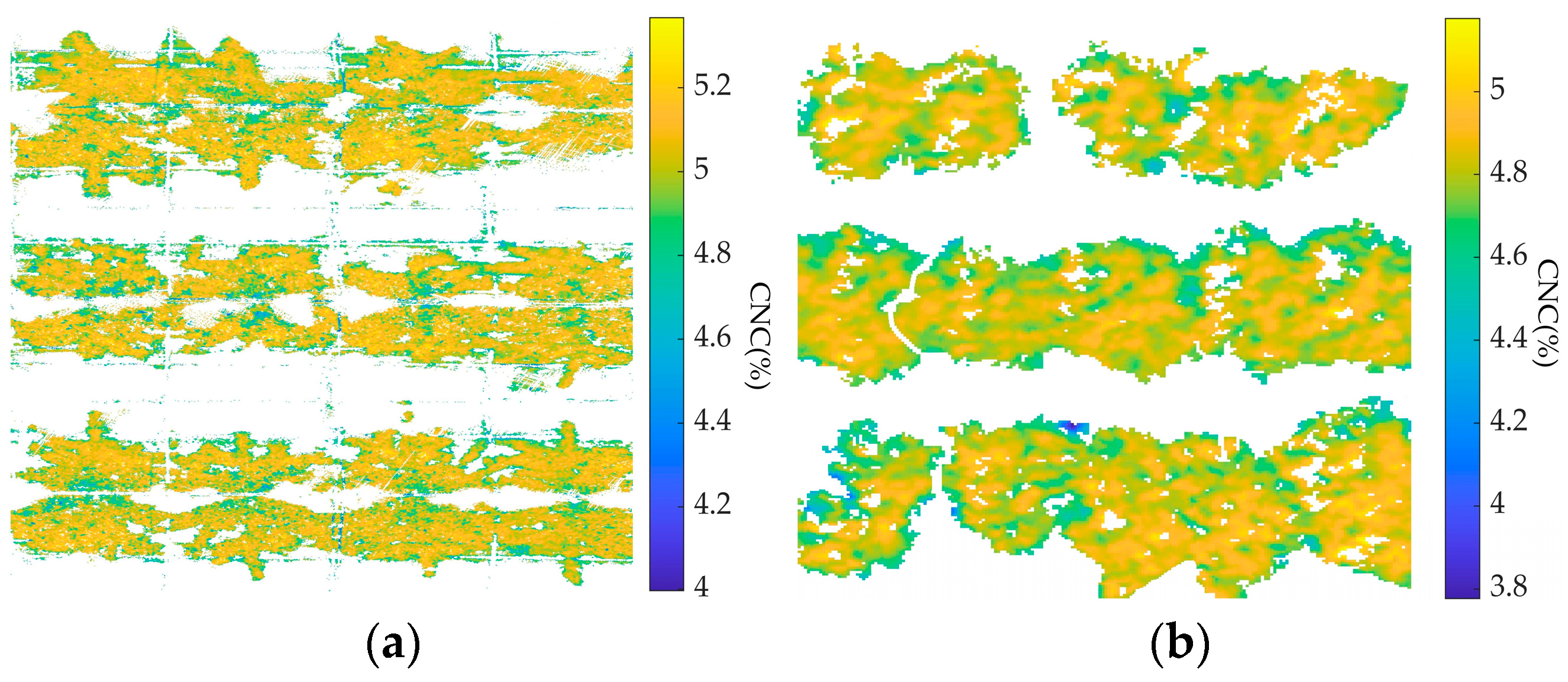 4.4. Performance Comparison of Canopy Extraction and CNC Inversion Based on TCE in the Two Orchards