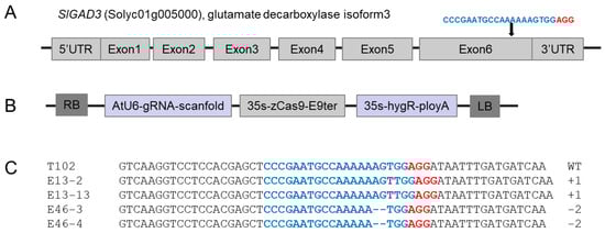 T0 generation plants were used to identify target SlGAD3 mutations. The genomic regions including the target sites were amplified with gene-specific primers (Table S1). The PCR products were directly sent for sequencing by Tsingke Biotech Co., Ltd. (Beijing, China). DECODR (https://decodr.org/, accessed on 2 April 2024) and Clustal Omega Multiple Sequence Alignment (https://www.ebi.ac.uk/jdispatcher/msa/clustalo, accessed on 20 August 2024) were used for sequence analysis.