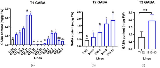 Four lines with increasing GABA content, E13-2, E13-13, E46-3, and E46-4, were chosen for further analysis. In the T2 generation, mutant lines consistently maintained elevated GABA levels compared to WT. The average content was 1.64 ± 0.34 mg/g FW, 1.90 ± 0.45 mg/g FW, 1.02 ± 0.47 mg/g FW, and 0.67 ± 0.29 mg/g FW, but the wild-type T102 was about 0.45 ± 0.11 mg/g FW (Figure 5b). GABA contents of E13-2 and E13-13 lines were significantly higher than T102, but E46-3 and E46-4 lines showed no significant difference from T102.