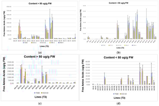 In the T2 generation, GABA(AA-47) levels of three gene-edited lines were significantly higher than T102. Other amino acids did not show a significant difference between T102 and gene-edited lines, although there were some changes in content compared to T102. AA-59 (L-Glutamic acid), AA-60 (L-Glutamine), and AA-75 (L-Tryptophan) accumulated more in T102 than in the gene-edited lines (Figure 6a,b).