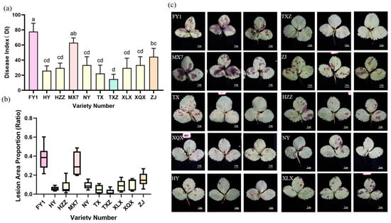 Comparison of lesion sizes and disease severity induced by inoculation with Cs.4J on leaves of different strawberry varieties. (a) Statistical analysis of DI on leaves of 10 strawberry varieties following inoculation with Cs.4J. Each data point represents the mean ± 95% confidence interval (95% CI) of three biological replicates (n = 3). Statistical analysis was performed using a unified method of one-way ANOVA followed by Duncan’s multiple range test for post hoc comparisons (p < 0.05). Different lowercase letters above the bars indicate significant differences. (b) Distribution of lesion area proportion (ratio of diseased area to total leaf area) among 10 distinct strawberry varieties at 11 dpi, visualized by box plots. Box plots display the median (center line), interquartile range (box), and 95% CI (whiskers) to illustrate data distribution characteristics. Statistical analysis was consistent with (a) (one-way ANOVA + Duncan’s multiple range test. (c) Representative leaf symptoms of 10 strawberry varieties at 11 dpi, showing the phenotypic variation in lesions.