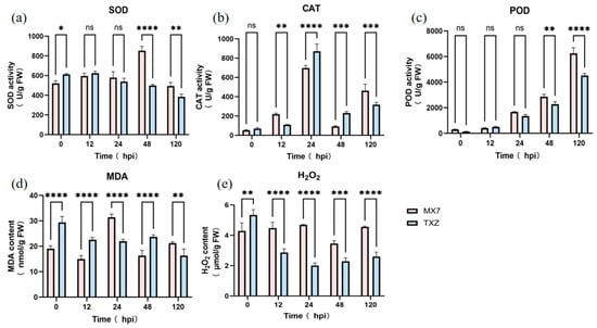 Leaf samples at 0, 12, 24, 48, and 120 hpi were collected, and superoxide dismutase (SOD), CAT, POD, MDA and H2O2 were measured. Approximately 0.1 g of leaf tissue was homogenized in 1 mL of extraction buffer under ice-cold conditions. The activities of SOD, CAT, and POD, as well as the concentrations of MDA and H2O2, were measured using commercial assay kits from Solarbio (Beijing, China) with the following product catalog numbers: SOD assay kit (Cat: BC0175), CAT assay kit (Cat: BC0205), POD assay kit (Cat: BC0095), MDA assay kit (Cat: BC0025), and H2O2 assay kit (Cat: BC3595). Absorbance was determined using a microplate reader. The activities of SOD, CAT, and POD were normalized against leaf fresh weight (FW) and expressed as units per gram of fresh weight (U/g FW). For MDA and H2O2, their concentrations were quantified via standard curves and presented as nanomoles per gram of fresh weight (nmol/g FW) and micromoles per gram of fresh weight (μmol/g FW), respectively. Three biological replicates ( n = 3) were set up for each time point (each replicate derived from an independent seedling) to ensure result reliability. No technical replicates were included for enzyme activity and biomarker measurements. Statistical analyses were performed using GraphPad Prism 10.1.2. Differences between ‘TXZ’ and ‘MX7’ across time points were analyzed by repeated-measures two-way ANOVA (factors: cultivar and time) followed by Tukey’s honest significant difference (HSD) test for post hoc pairwise comparisons. A significance level (α) was set at 0.05, and p-values were adjusted for multiplicity via the Tukey method. Symbols indicating significant differences in the figures correspond to the adjusted p-values from the post hoc test.