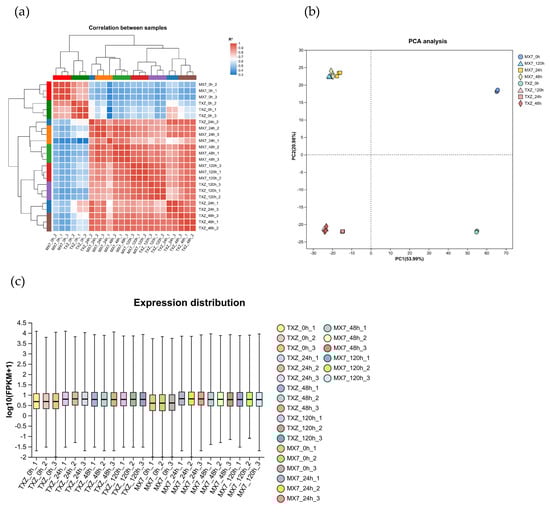 Validation of transcriptome data reproducibility and sample analysis. (a) Sample correlation heatmap. (b) PCA: Samples from the same cultivar (‘TXZ’/’MX7’) at identical time points cluster tightly in the principal component space. (c) Gene expression distribution boxplot: the transformed log10(FPKM + 1) expression levels exhibit consistent distribution ranges across all samples, with medians clustered between 2–3 log10 units and low dispersion, confirming that data stability is suitable for downstream analysis.