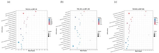 KEGG enrichment analysis of DEGs. (a) KEGG enrichment at 0 h; (b) 24 hpi; (c) 48 hpi. Y-axis, pathways; X-axis, DEG-to-pathway ratio.