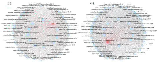 Hub gene identification in disease resistance-associated MEred and MEbrown modules. (a) Key regulatory genes in the brown (MEbrown) module. (b) Key regulatory genes in the red (MEred) module. Each node represents a gene, with the node size corresponding to its degree. Larger nodes indicate higher within-module connectivity.