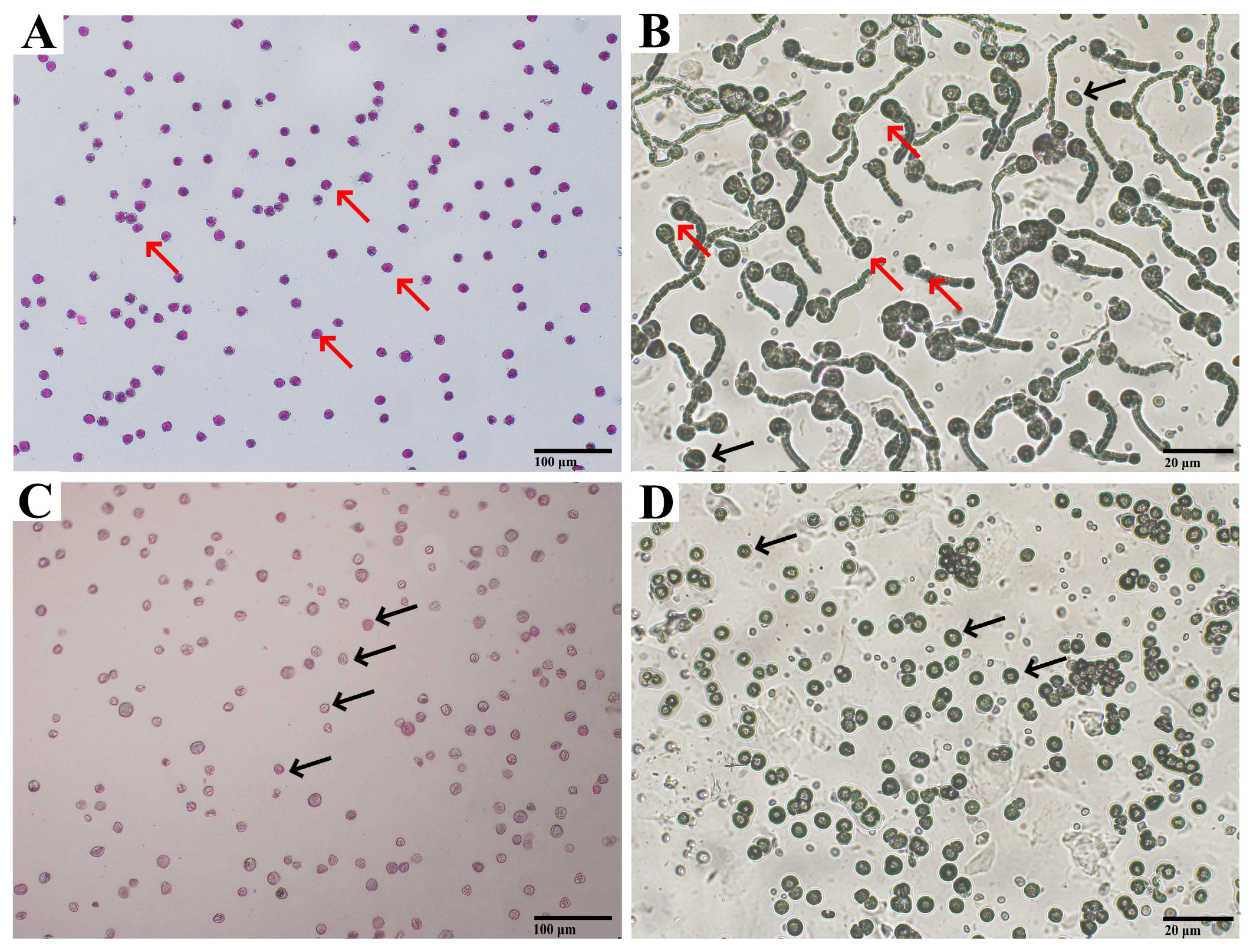 Figure 1. Example of staining (A,C) and germination method (B,D) of pollen viability determination. Note: (A,B). 5-313; (C,D). 2-120; the black arrow represents non-viable pollen, and the red arrow represents viable pollen.
