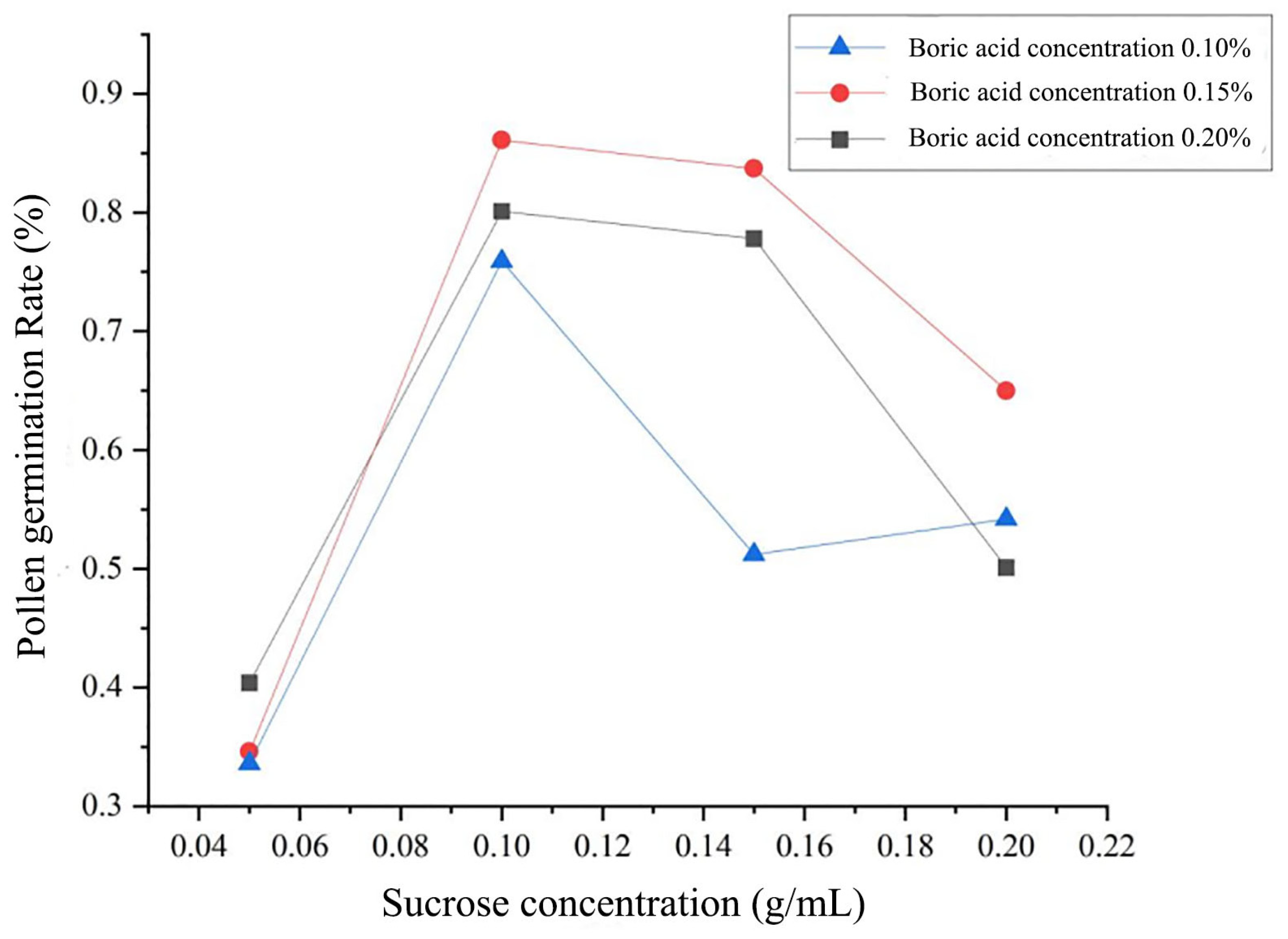 A full factorial design was used for the in vitro pollen germination assay. Solid culture media with all combinations of sucrose concentrations (5%, 10%, 15%, 20%) and boric acid levels (0.1%, 0.15%, 0.2%) were prepared to find the optimal composition and assess any potential interaction between the factors. Sample 5-327, which contained abundant pollen and exhibited high viability as indicated by staining, was selected as the test material. An appropriate amount of pollen was evenly spread on the surface of the medium and incubated in darkness at 25 °C and 90% relative humidity for four hours. Germination was observed under a microscope, with a pollen tube length at least equal to the pollen diameter considered the indicator of successful germination. The same counting method used for the staining process was applied.