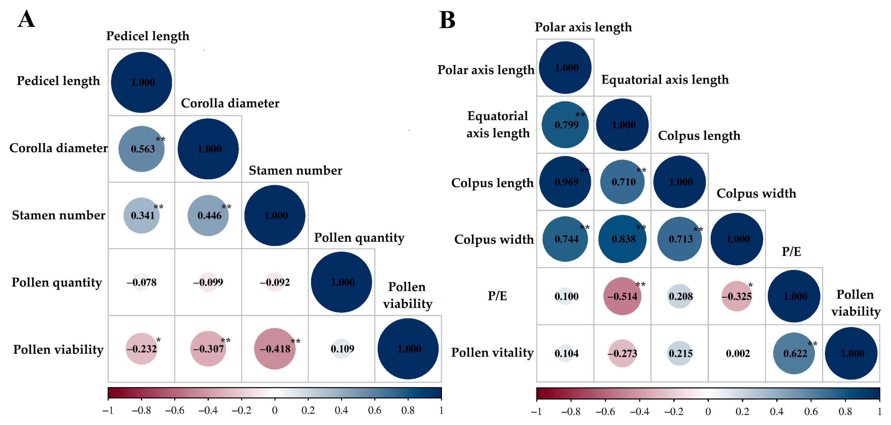 Figure 4. Correlation analysis images: (A) correlation analysis between pollen vitality and floral traits; (B) correlation analysis between pollen vitality and pollen morphology; The bubble area is proportional to the magnitude of the correlation coefficient. * indicates p < 0.05 (significant correlation), ** indicates p < 0.01 (extremely significant correlation).