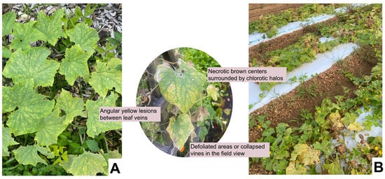 Downy mildew (DM), caused by the obligate biotroph Pseudoperonospora cubensis, is one of the most destructive diseases affecting cucumber production in humid regions [73]. Over the decades, this pathogen has been responsible for annual yield losses of up to 80% [74]. It exhibits a broad host range, infecting over 60 different plant species within the Cucurbitaceae family [73,75,76]. Symptoms typically begin as small, angular, chlorotic lesions delimited by veins on the adaxial leaf surface, which enlarge, turn from yellow to brown, become necrotic, and, in severe epidemics, lead to extensive defoliation and plant death (Figure 2) [77,78]. Sporulation of P. cubensis is favored by high relative humidity (>94%) and a dark period of >6 h, with optimal temperatures for infection around 15 °C [77,79]. Sporangia, dispersed by wind or water splashes, release biflagellate zoospores upon deposition on damp leaves; the zoospores move to stomatal apertures, encyst, and germinate, forming germ tubes that penetrate the leaf [80,81]. Beneath the stomata, a substomatal vesicle and intercellular hyphae are established; these hyphae form clavate haustoria in mesophyll cells for nutrient uptake and effector delivery that suppress host defenses [82,83]. Under favorable circumstances, sporangiophores then emerge via stomata, usually on the abaxial leaf surface, to generate additional sporangia, causing secondary spread [80]. The management for this historically relied on fungicide applications, using active ingredients such as cyazofamid, ametoctradin, propamocarb hydrochloride, and azoxystrobin [84]. However, fungicides offer only short-term protection and rarely provide lasting control, focusing on host resistance as the most reliable option.