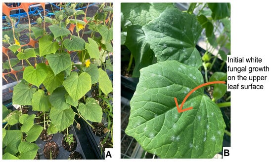 Powdery mildew (PM) is one of the most destructive foliar diseases of cucumber, primarily caused by two obligate biotrophic fungi, Podosphaera xanthii (syn. Sphaerotheca fuliginea) and Golovinomyces cichoracearum (syn. Erysiphe cichoracearum). PM leads to severe yield losses ranging from 20% to 40% [179]. PM infection is characterized by the formation of white, powdery fungal colonies on both upper and lower leaf surfaces, petioles, and stems, which gradually result in leaf chlorosis, necrosis, and premature senescence, ultimately reducing photosynthetic efficiency and fruit quality (Figure 3) [179,180]. The disease spreads rapidly under warm and humid conditions due to its short incubation period and high sporulation rate.