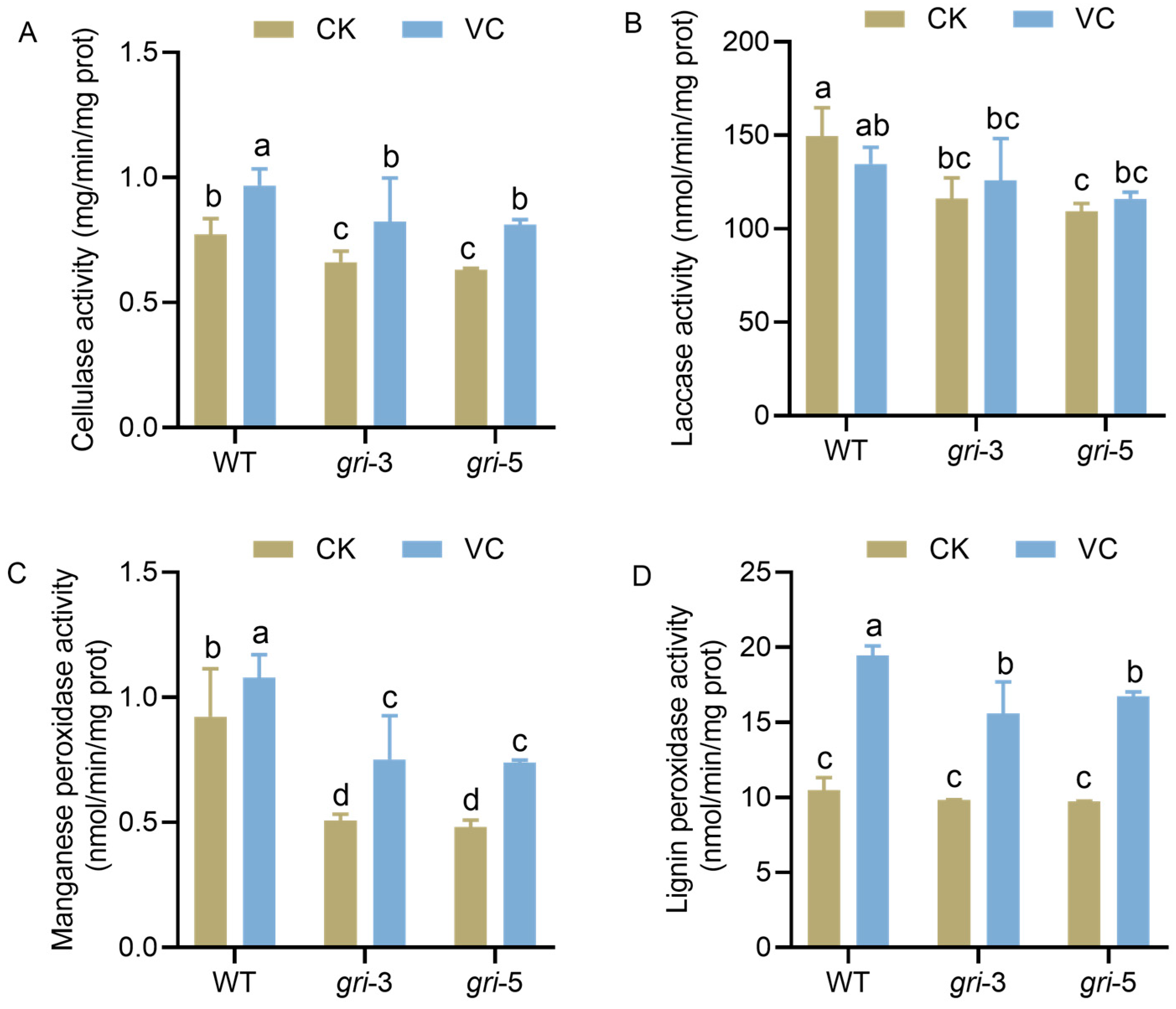 3.5. Vc Supplementation Restores Lignocellulose-Degrading Enzyme Activity in H. marmoreus gri Strains