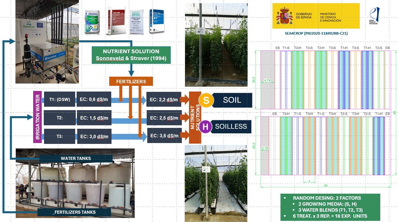 The experimental design was based on a randomized complete block layout with two factors: the salinity of the water blends and the type of growing medium. Three salinity levels were evaluated. Treatment T1, serving as the control treatment, was irrigated with 100% desalinated seawater (DSW), sourced from the Carboneras desalination plant, with an electrical conductivity (EC) of 0.6 dS m