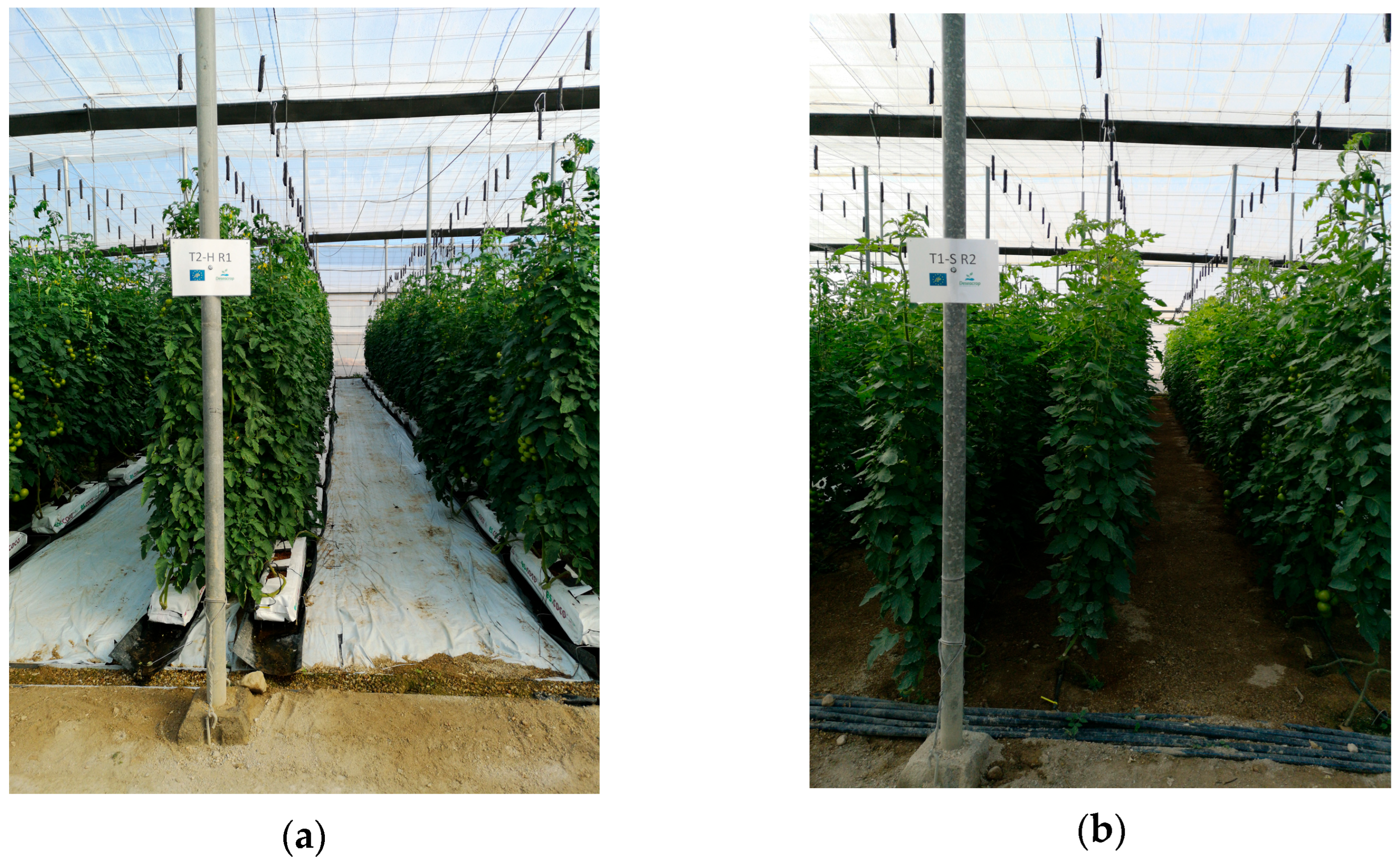 The second factor was the growing medium, composed of two different treatments representative of the predominant cropping systems in Almería: soil (S) and soilless substrate culture (H) (