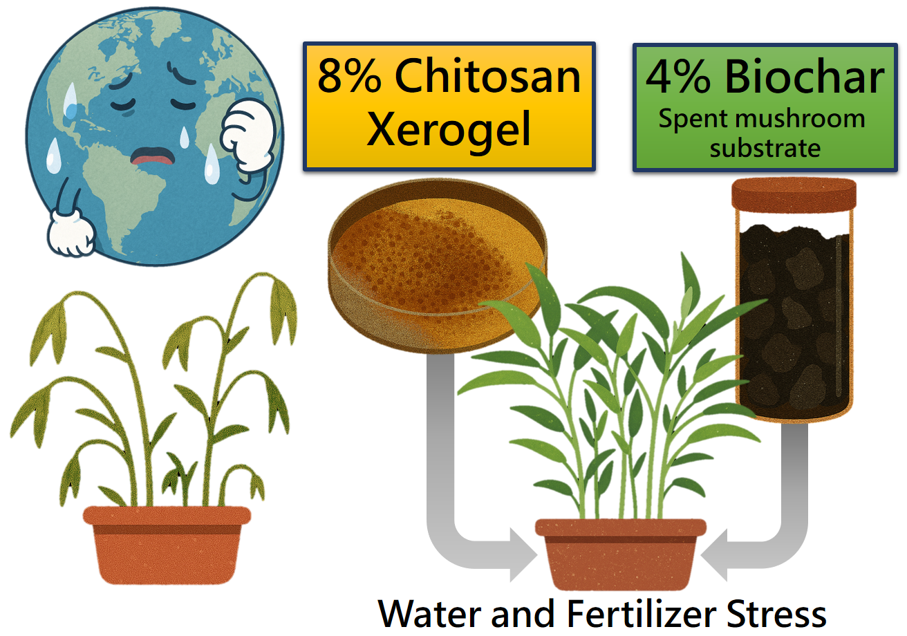 The aim of this study was to evaluate the synergistic effect of combining biochar and chitosan xerogel on water spinach under water or fertilizer stress. To achieve this, the research sought to determine the positive impact of this dual amendment on fresh biomass and yield, while simultaneously assessing the corresponding improvements in nutrient uptake. By comparing the combined treatment’s efficacy against single amendments and optimal growth conditions, the study aimed to confirm the synergistic benefit and highlight its practical importance as a sustainable strategy for enhancing crop performance while potentially reducing resource inputs. Collectively, this research sought to maximize plant vigor and nutrient efficiency in challenging agricultural settings.