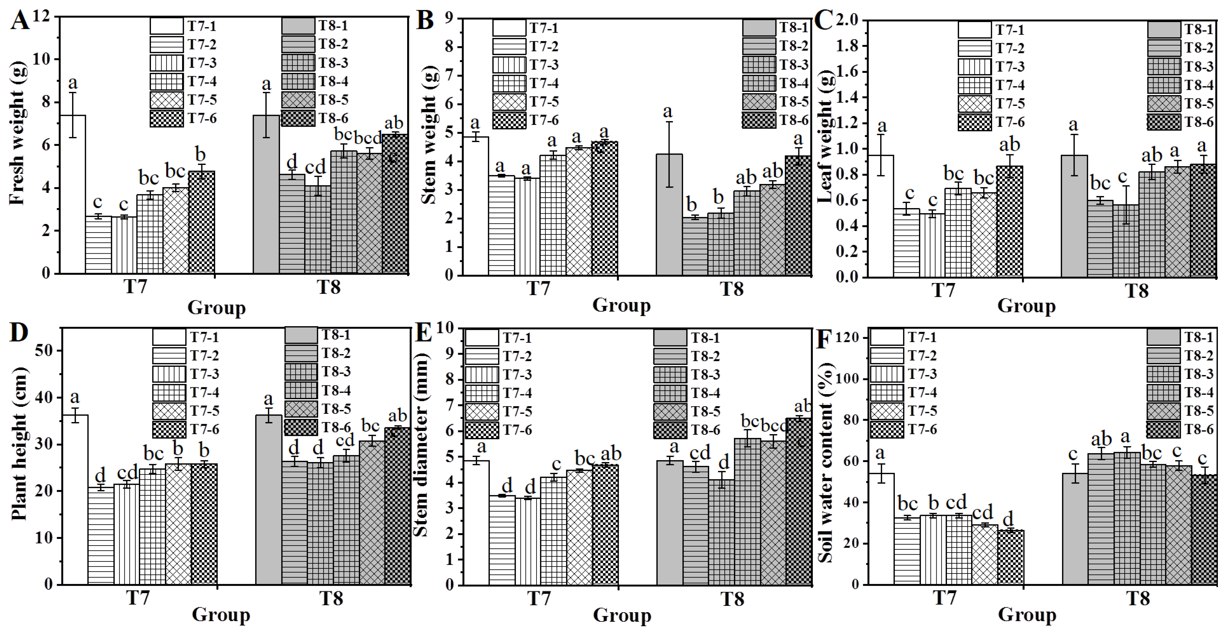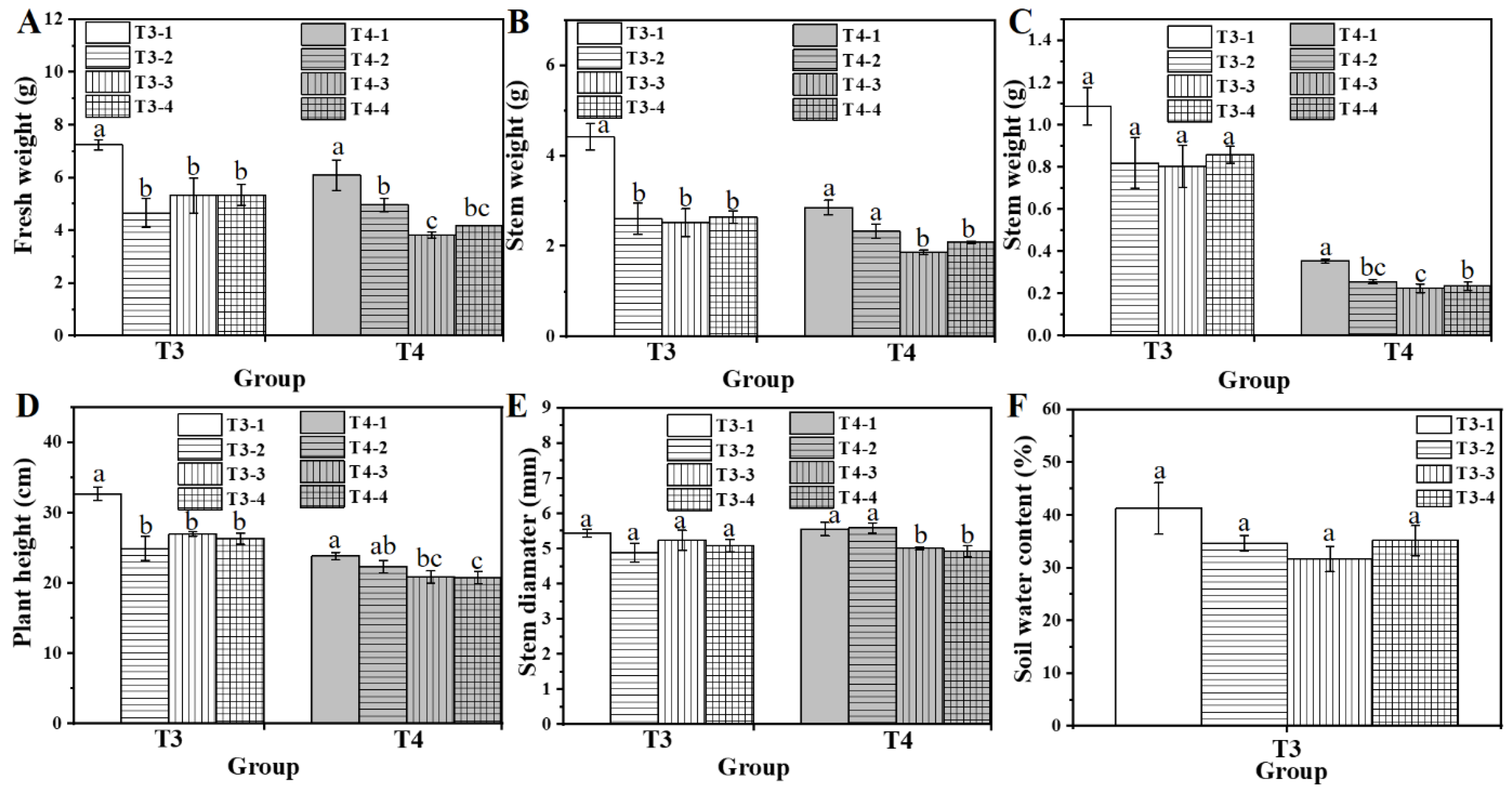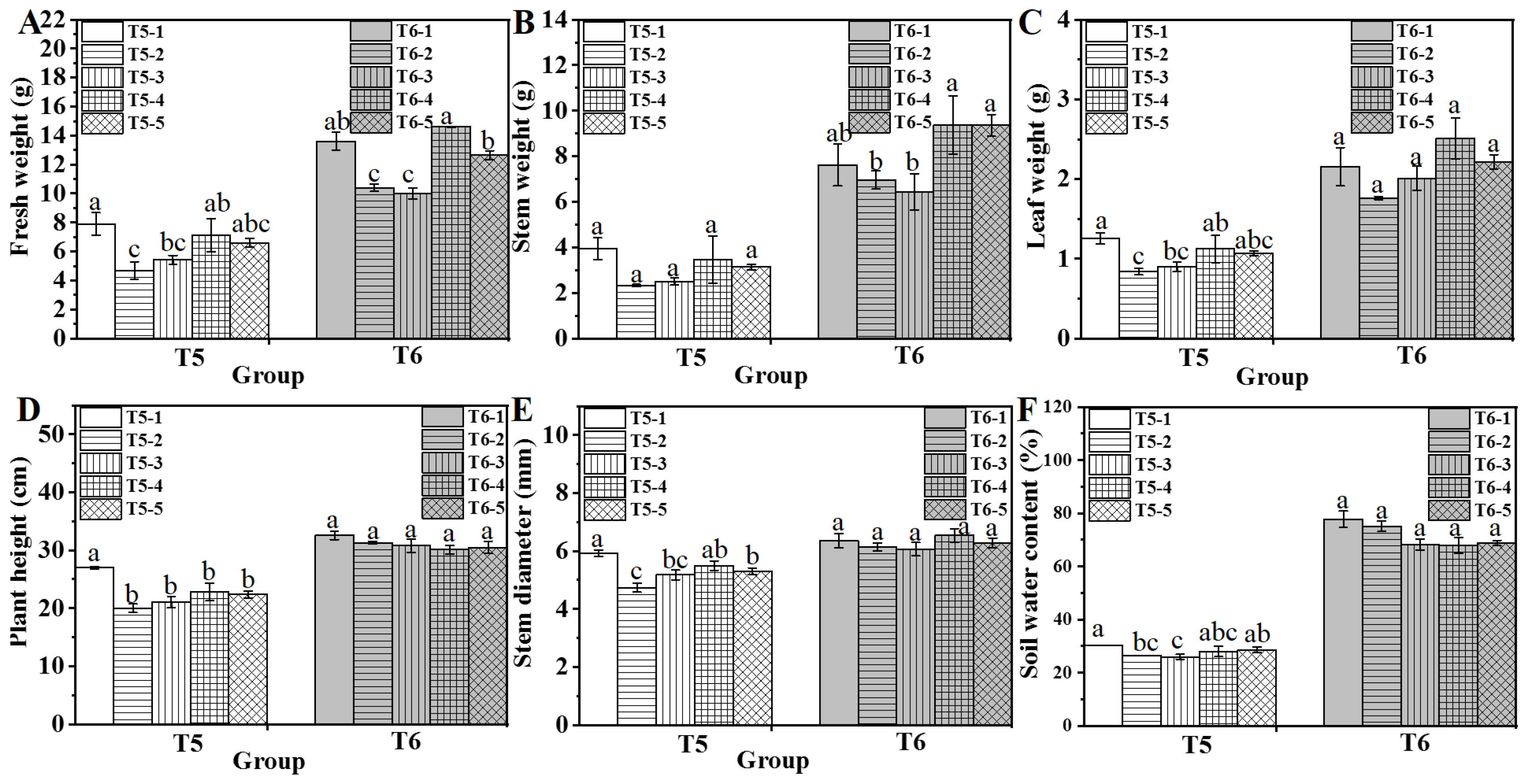 Figure 1. The effects of various water and fertilizer treatments on the fresh weight (A), stem weight (B), leaf weight (C), plant height (D), stem diameter (E), and soil moisture content (F) of the T1 treatment of water spinach. Lowercase letters (a, b, and c) indicate a significant difference at the p < 0.05 level, as determined by the ANOVA test.