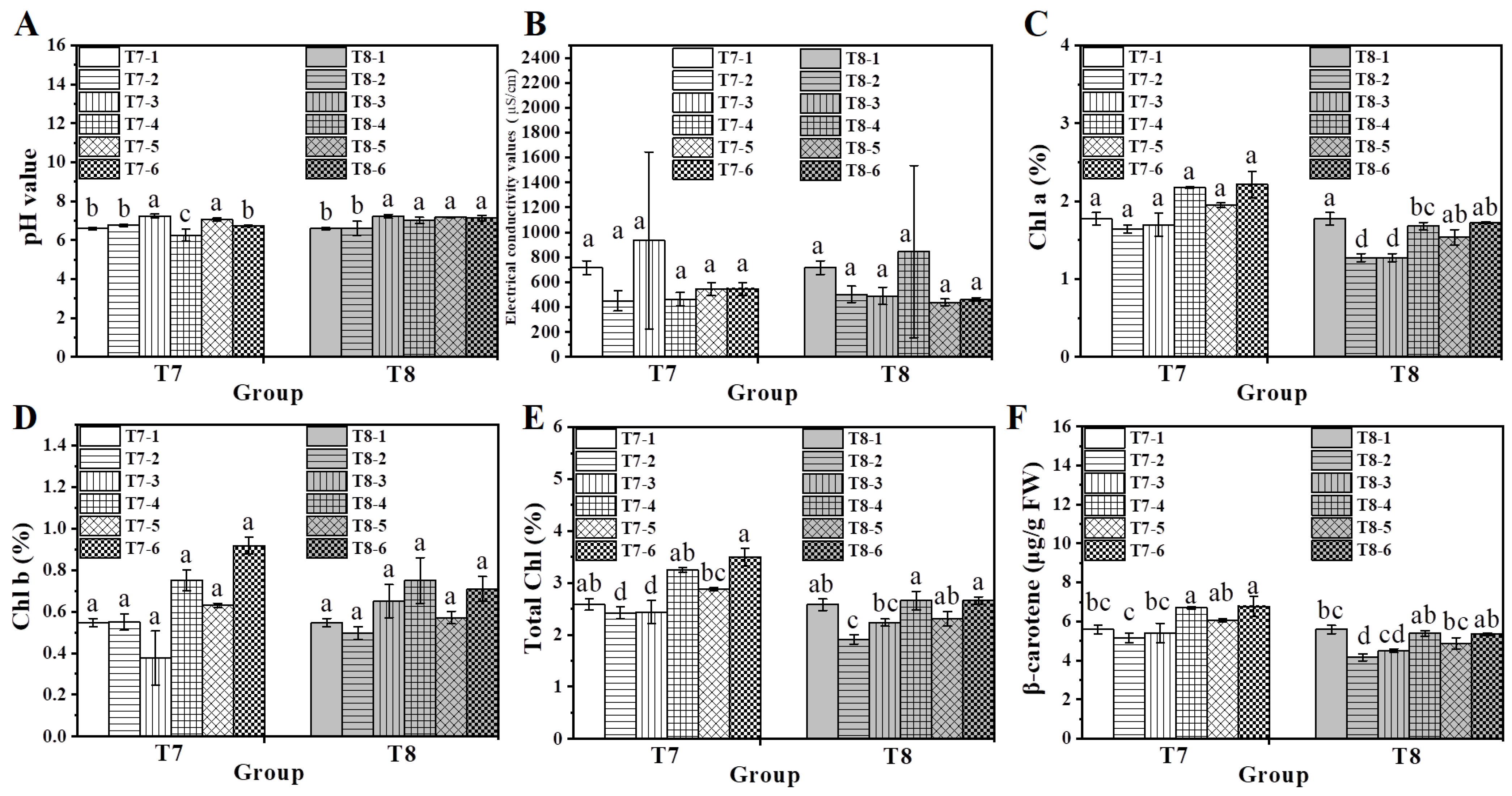 Substrate pH and conductivity values remained neutral across all treatments, indicating that the addition of biochar and chitosan xerogel did not alter substrate properties (Figure 8A,B). Chlorophyll and β-carotene contents in spinach leaves were subsequently analyzed (Figure 7). Under water-deficient conditions, the composite treatments of 0.4% chitosan xerogel (T7-5) and 0.8% chitosan xerogel combined with 4% biochar (T7-6) yielded significantly higher levels of chlorophyll and β-carotene in comparison to the untreated hydric-deficient group (T7-2) and the biochar-only treatment (T7-3) (Figure 8C–F).