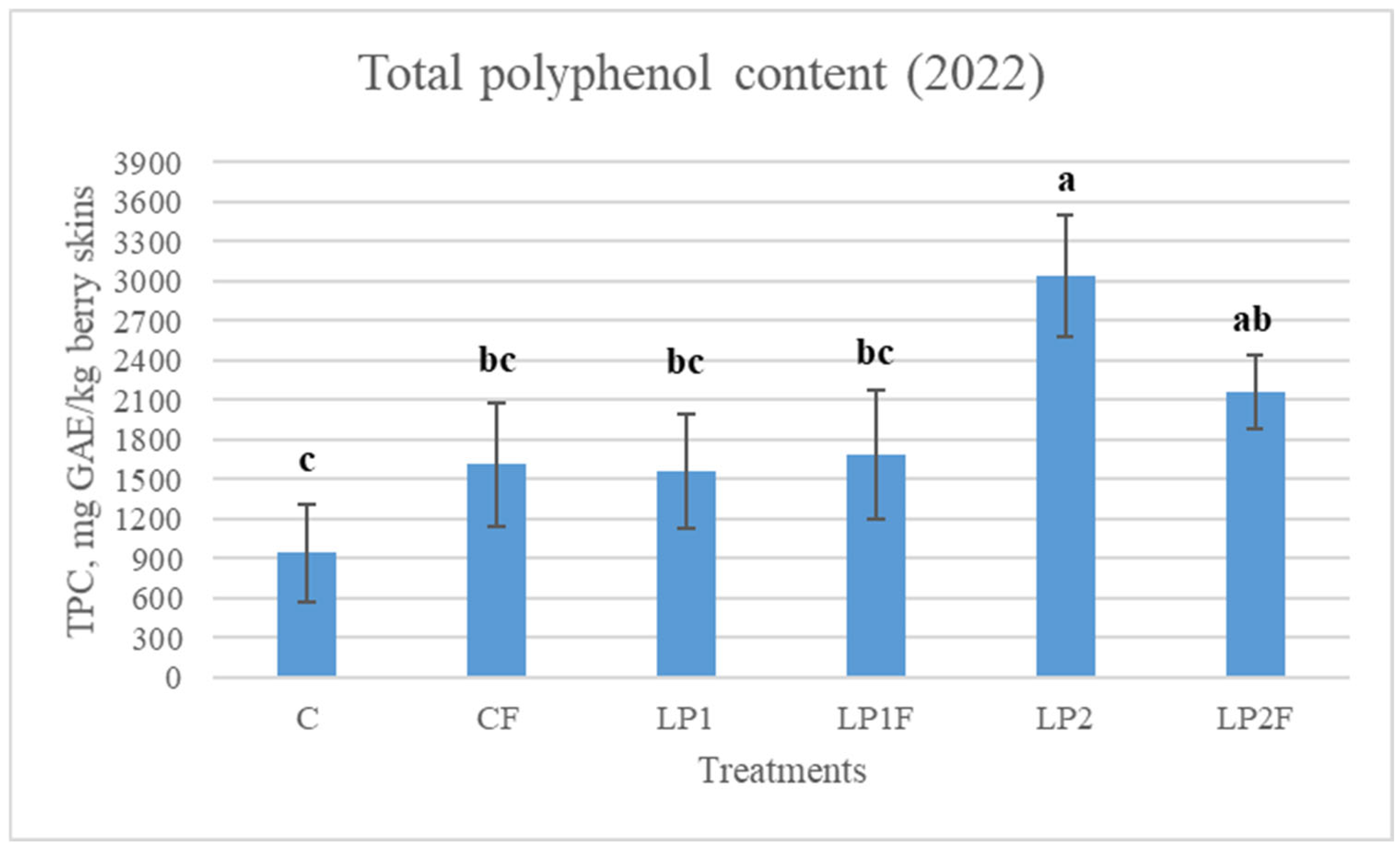 | Bunch/vine | 2022 | 13.2 ± 3.3 a | 14.9 ± 3.5 a | 12.6 ± 5.1 a | |||