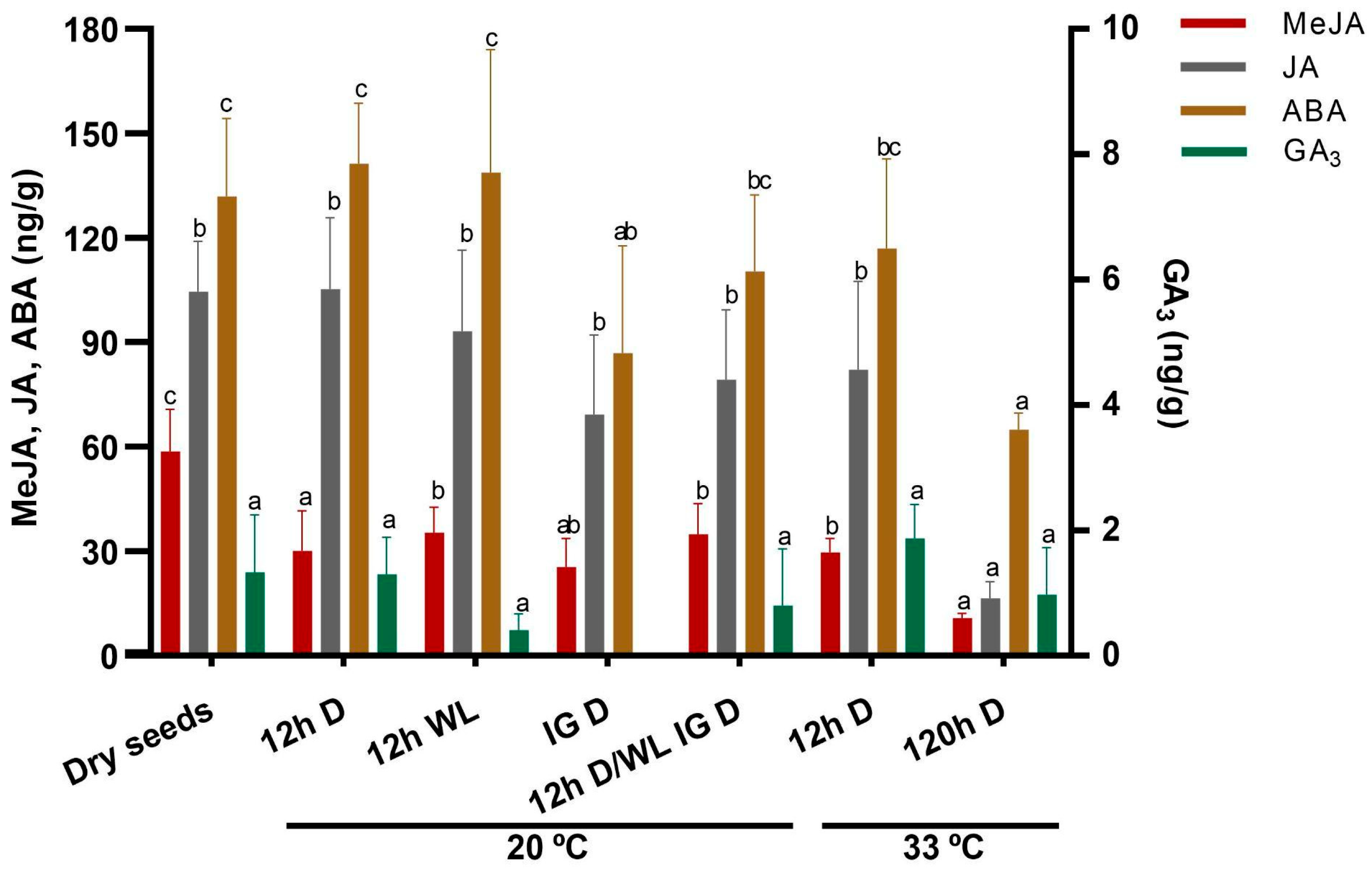 3.3. Effect of Temperature and Light Treatments on Phytohormone Levels