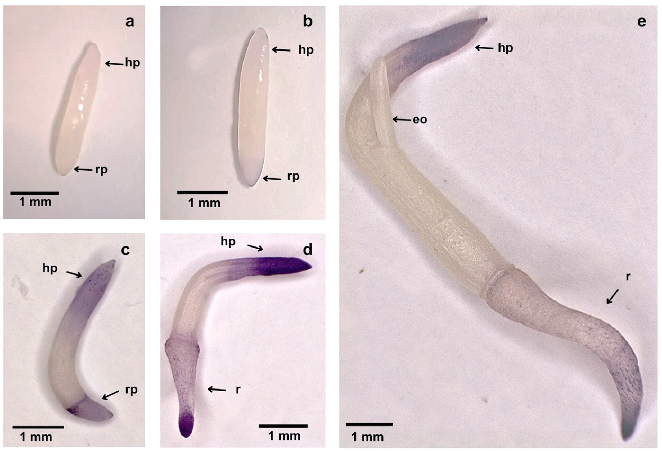 - Xia, Q.; Ponnaiah, M.; Thanikathansubramanian, K.; Corbineau, F.; Bailly, C.; Nambara, E.; El-Maarouf-Bouteau, H. Re-localization of hormone effectors is associated with dormancy alleviation by temperature and after-ripening in sunflower seeds. Sci. Rep. 2019, 9, 4861. [Google Scholar] [CrossRef] [PubMed]