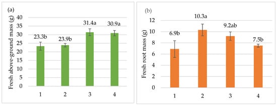 The effect of different substrates on the fresh above-ground (a) and root (b) mass of sweet pepper seedlings: 1—peat, 2—peat+zeolite 1:1, 3—peat+zeolite 2:1, 4—peat+zeolite 3:1. According to Tukey’s significant difference test, means with different letters are significantly different at the p < 0.05 level. Error bars show standard deviation.