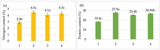 The effect of different substrates on the content of nitrogen (a) and protein (b) in leaves of sweet pepper seedlings: 1—peat, 2—peat+zeolite 1:1, 3—peat+zeolite 2:1, 4—peat+zeolite 3:1. According to Tukey’s significant difference test, means with different letters are significantly different at the p < 0.05 level. Error bars show standard deviation.