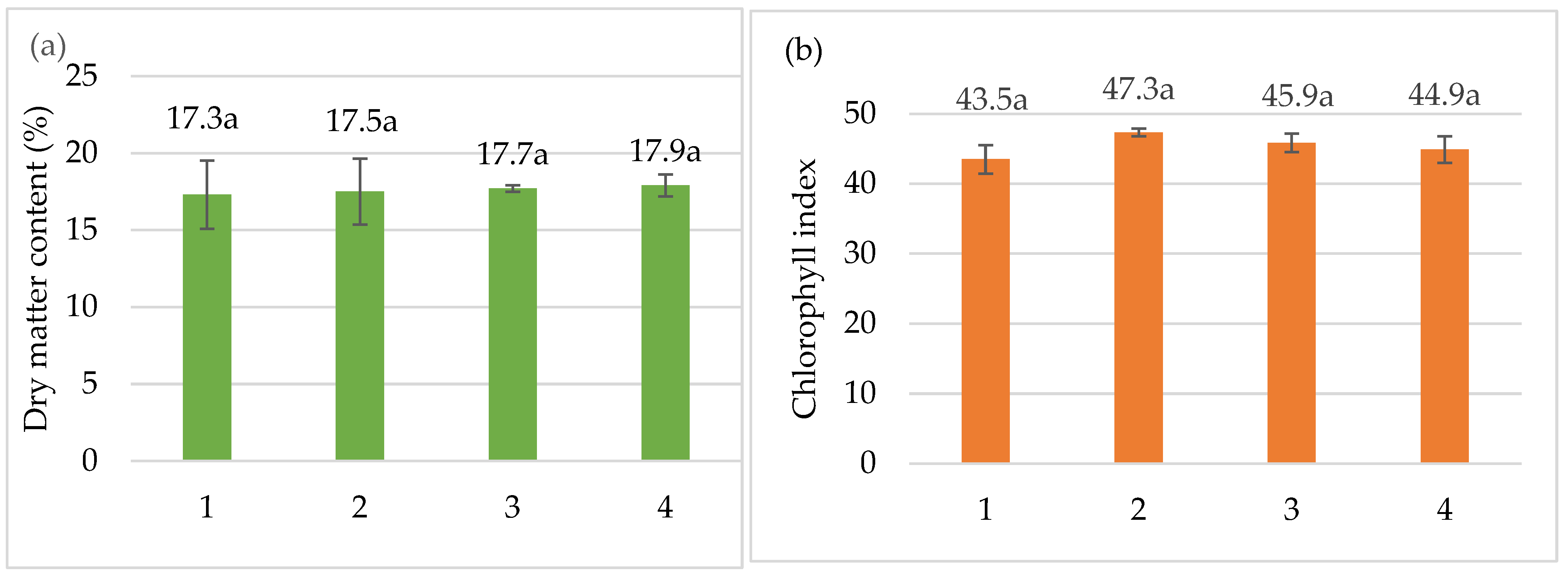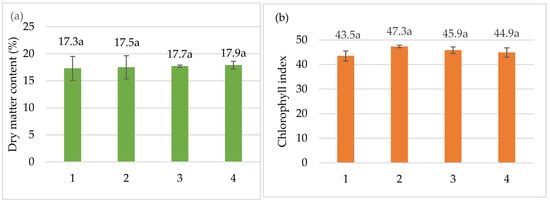 The effect of different substrates on the content of dry matter (a) and chlorophyll index (b) in leaves of sweet pepper plants during fruiting: 1—peat, 2—peat+zeolite 1:1, 3—peat+zeolite 2:1, 4—peat+zeolite 3:1. According to Tukey’s significant difference test, means with different letters are significantly different at the p < 0.05 level. Error bars show standard deviation.