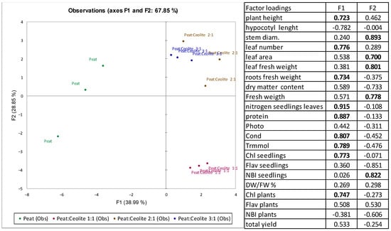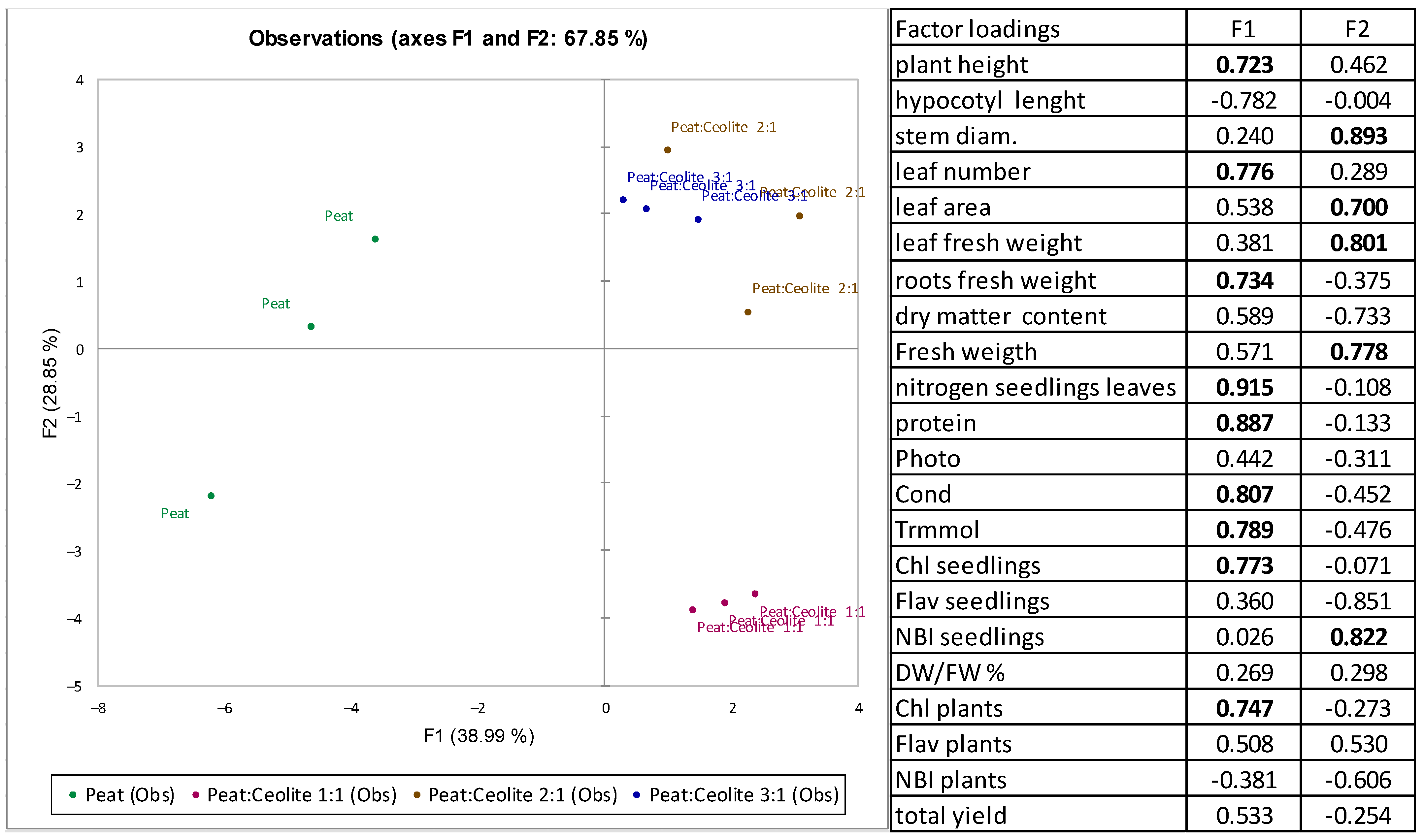 Peat-zeolite 1:1 treatment is prominently positioned at the bottom right of the F2 axis, indicating the maximum weight of fresh leaves, stems, and total fresh mass. The elevated values of F1 and F2 clearly illustrate that this mixture significantly enhances the morpho-physiological parameters of peppers. The results include taller plants, a greater number of leaves, increased overall biomass, and elevated levels of nitrogen and protein, along with improved transpiration and stomatal activity. The yield change was significantly affected in all treatments with zeolite compared to the peat substrate.