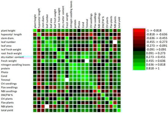 Correlation matrix of the effect of different substrates on sweet pepper parameters.