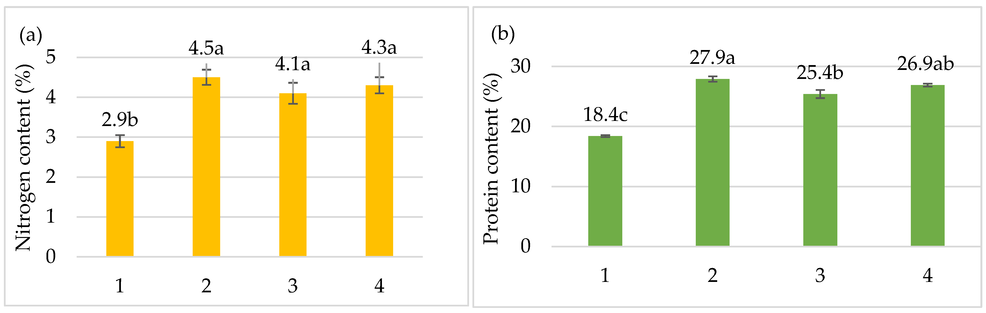 Plants for analysis were taken from three replicates of each treatment, 5 plants per replicate. Analyses were performed in three analytical repetitions. The total nitrogen in the seedlings’ leaves was determined using the Kjeldahl method (Directive 72/199/EEB). Protein content was determined using the Kjeldahl method (Directive 72/199/EEB). Approximately 1 g of raw material was hydrolyzed with 15 mL concentrated sulfuric acid (H2SO4) containing two copper catalyst tablets in a heat block (Kjeltec system 2020 digestor, Tecator Inc., Herndon, VA, USA) at 420 °C for 2 h. After cooling, H2O was added to the hydrolysates before neutralization and titration. The amount of total nitrogen in the raw materials was multiplied by the traditional conversion factor of 6.25 and species-specific conversion factors to determine total protein content.
