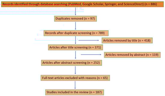 The search and selection processes are summarized in the PRISMA flow diagram (Figure 1). A total of 886 articles were initially identified across all databases. After removing duplicates (97), 789 articles were screened by title and abstract, of which 699 were excluded for irrelevance. Finally, 187 full-text articles met the inclusion criteria and were incorporated into this review.