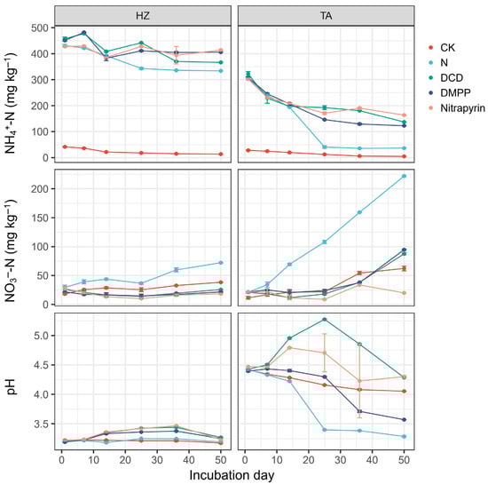 Changes in soil NH4+-N, NO3—-N, and pH during the incubation. Error bars indicate standard deviation of four replicates.