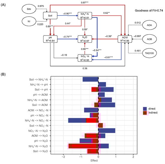 The relationship between site, NI, soil pH, NH4+-N, NO3−-N, and AOM. (A) The path model outputs. The numbers on the arrows are standardized path coefficients; the red or blue lines indicated a positive or negative effect. Path coefficients and coefficients of determination (R2) were calculated using 999 bootstraps. R2 values indicated the variance explained by the block. The Goodness-of-Fit (GoF) statistic is a measure of the overall prediction performance. GoF > 0.7 represents an acceptable ‘good’ fit. (B) The standardized path coefficients of the direct, indirect, and total effects on cumulative N2O emissions. *, **, and *** represent p values less than 0.05, 0.01, and 0.001, respectively.