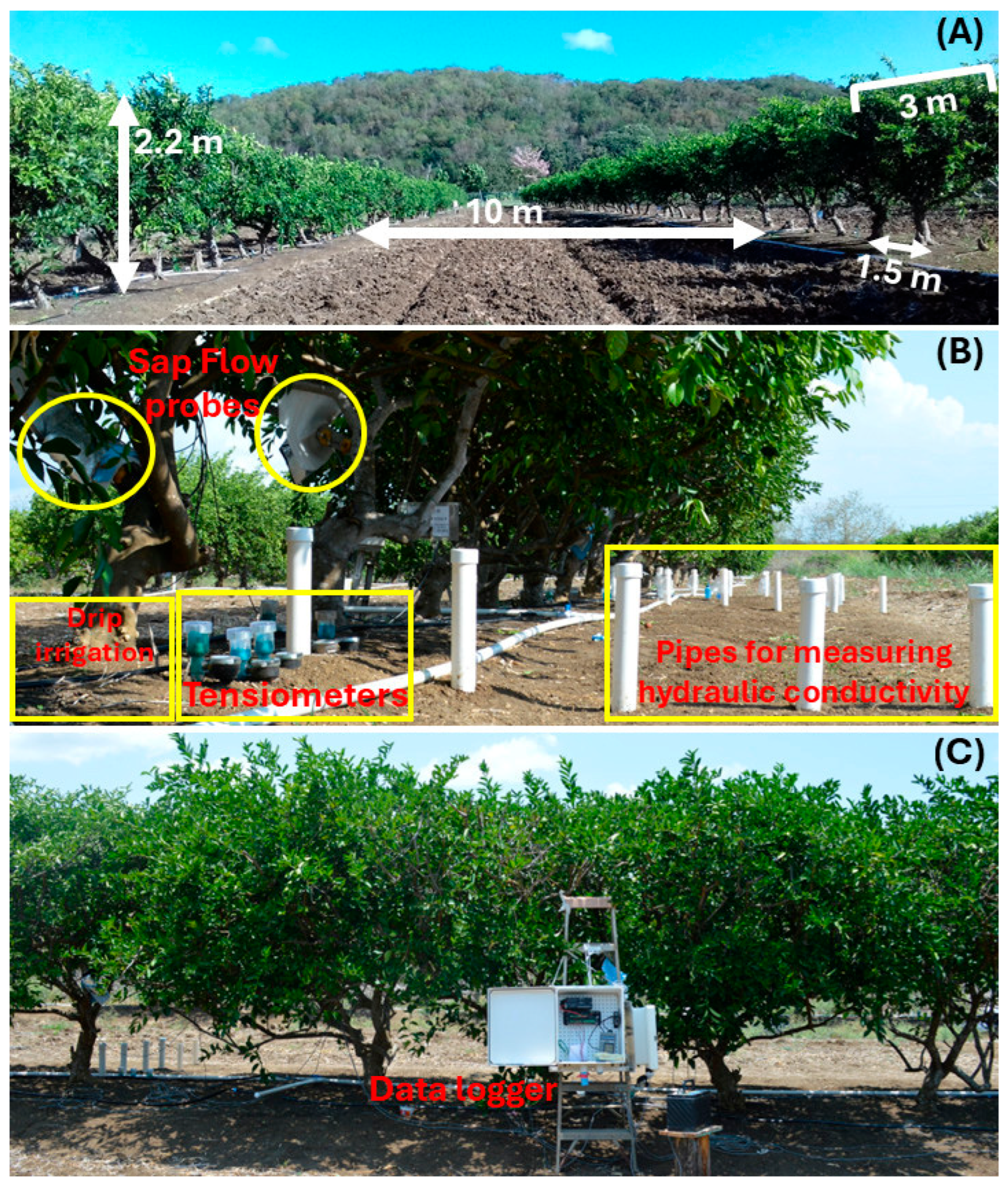 - Rivera-Hernández, B.; González-Jiménez, V.; Carrillo-Ávila, E.; Garruña-Hernández, R.; Andrade, J.L.; Quej-Chi, V.H.; Arreola-Enríquez, J. Yield, Physiology, Fruit Quality and Water Footprint in Persian Lime (Citrus latifolia Tan.) in Response to Soil Moisture Tension in Two Phenological Stages in Campeche, México. Water 2022, 14, 1011. [Google Scholar] [CrossRef]